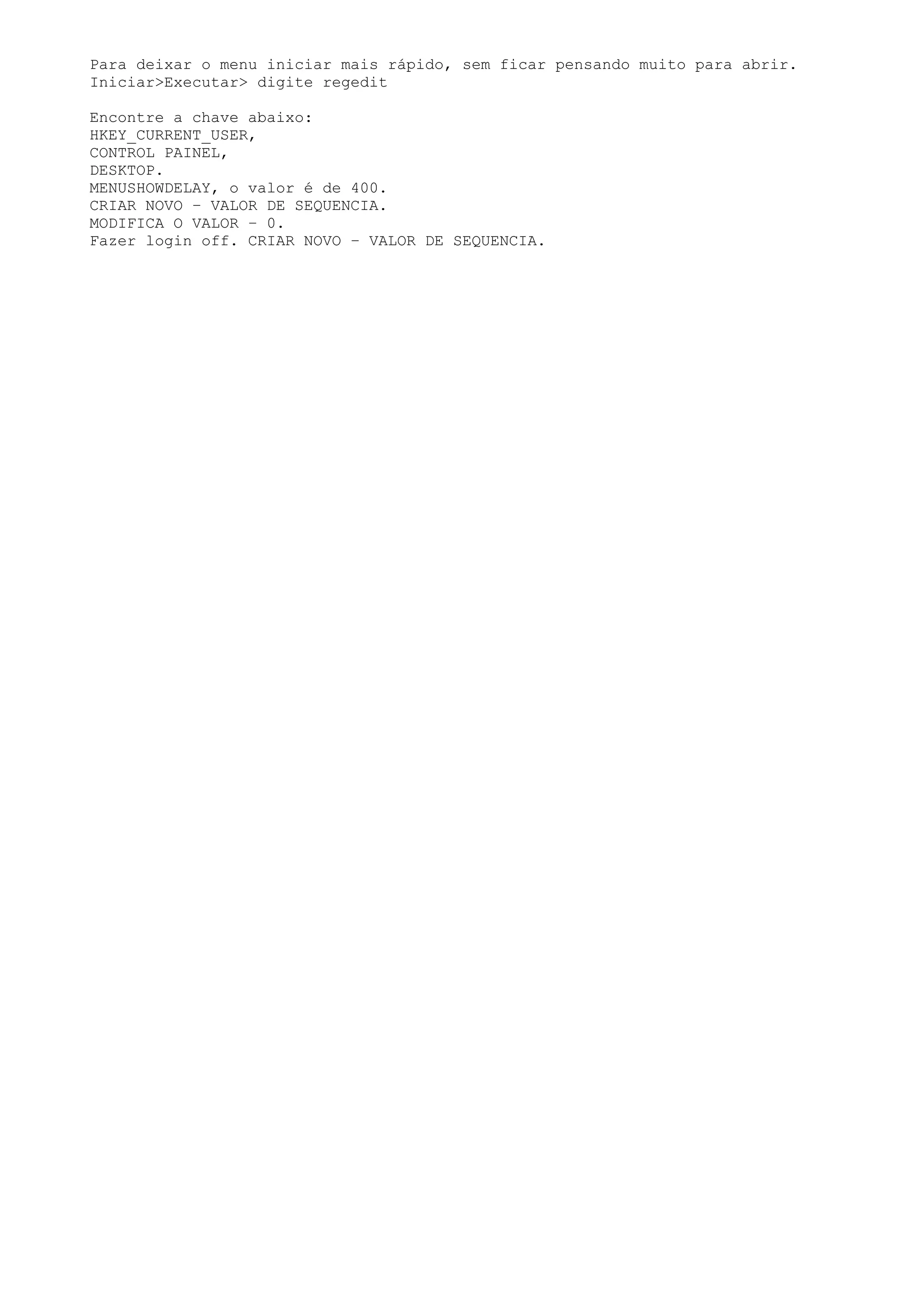 O documento fornece instruções para tornar o menu iniciar do Windows mais rápido, alterando o valor do registro da chave "MENUSHOWDELAY" de 400 para 0 usando o editor de registro.