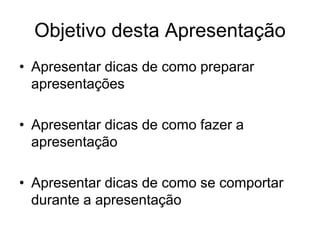 Este documento fornece dicas para preparar e fazer apresentações de forma eficaz, incluindo: planejar os slides com um roteiro, tópicos e palavras-chave; dividir o conteúdo em vários slides de 1 minuto cada; e praticar a apresentação para memorizar o fluxo. Também fornece dicas para o comportamento durante a apresentação, como falar devagar, fazer contato visual e usar apontadores.
