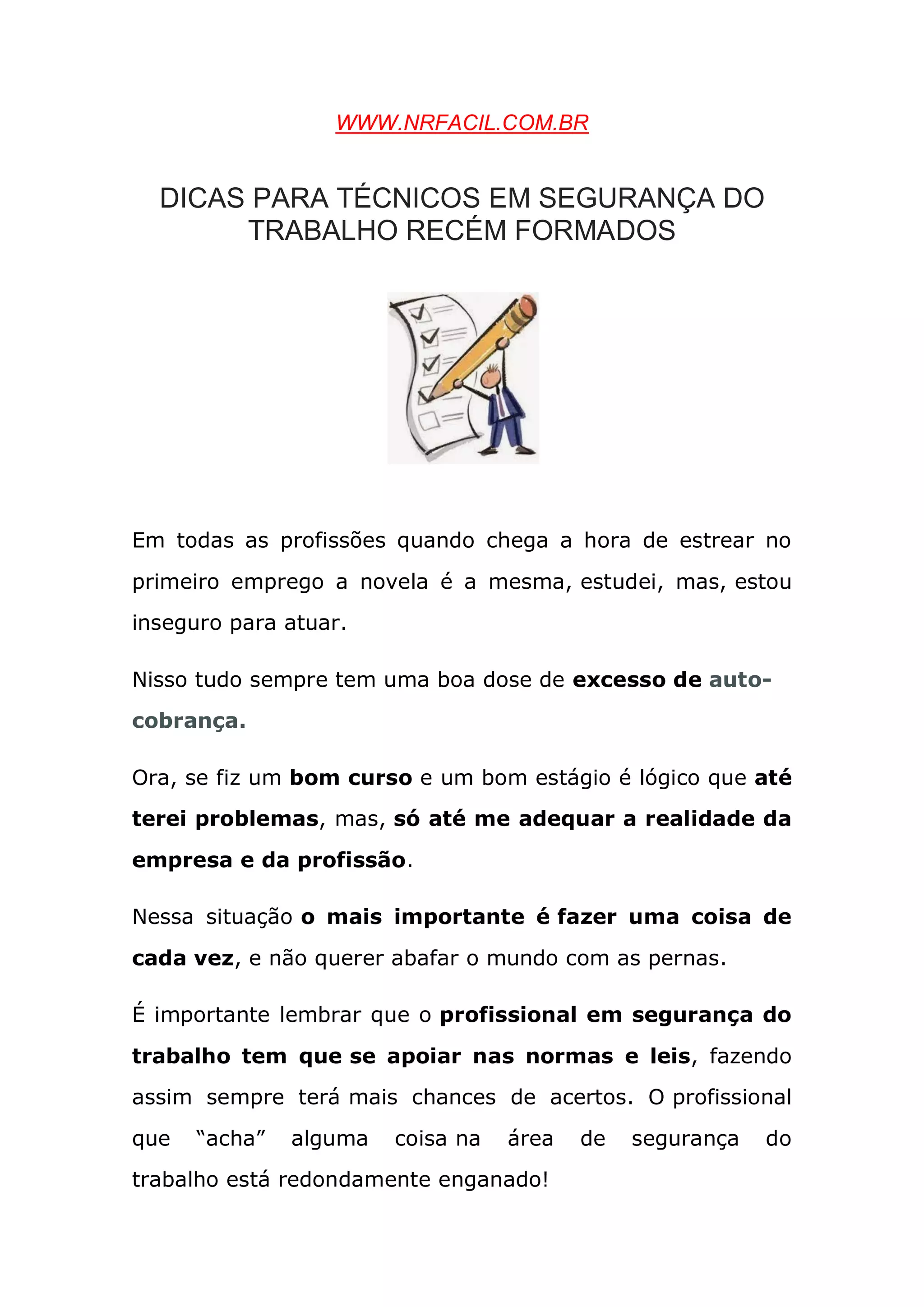 Este documento fornece dicas para técnicos em segurança do trabalho recém-formados, enfatizando a importância de: 1) conhecer bem a empresa e os riscos envolvidos; 2) apoiar-se nas leis e normas para tomar decisões; e 3) estar sempre estudando para aperfeiçoar os conhecimentos.