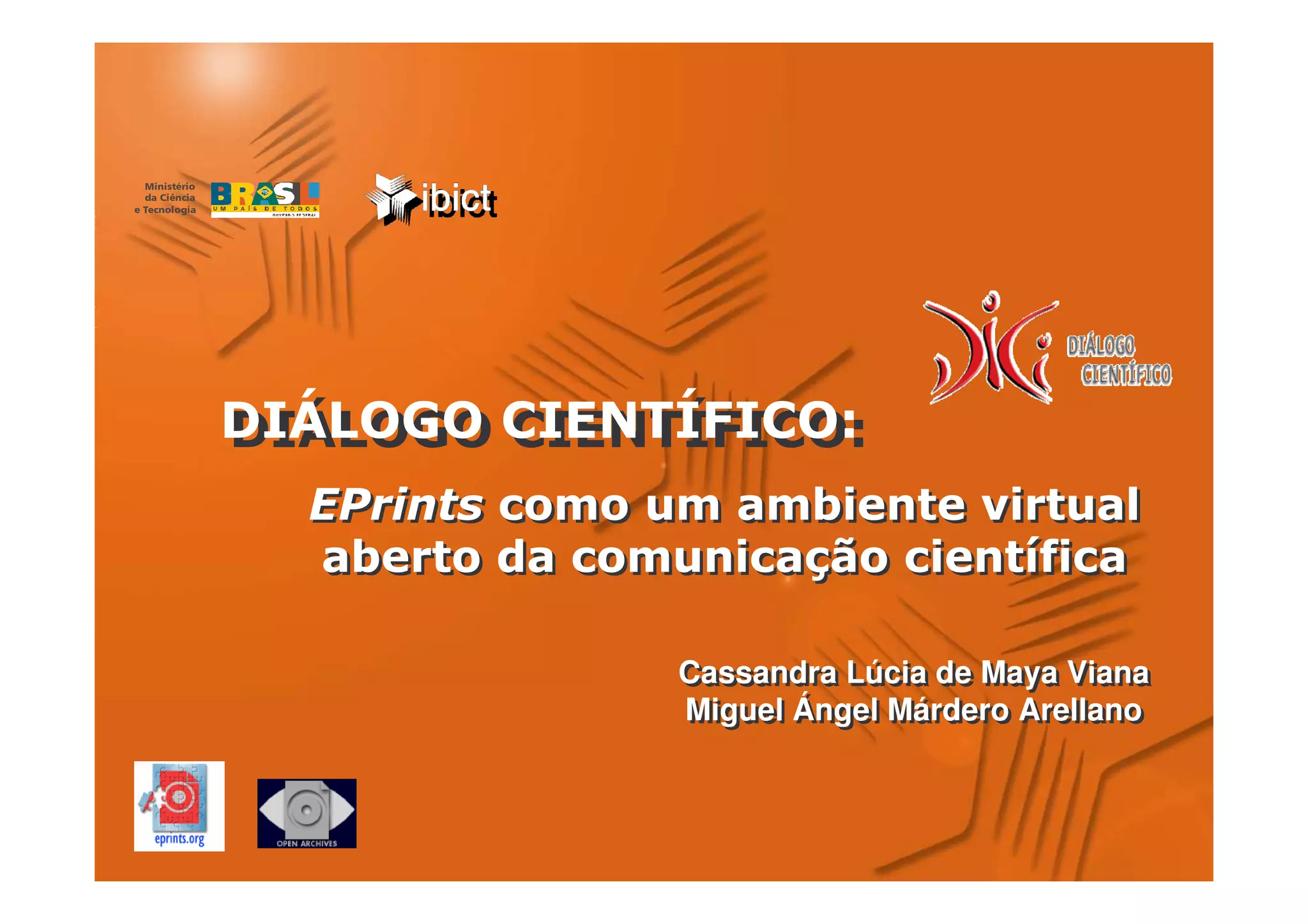 O documento discute a comunicação científica e as mudanças no compartilhamento de conhecimento. Ele também apresenta o software EPrints para repositórios institucionais e descreve o diálogo científico e o registro de repositórios de acesso aberto. Por fim, discute considerações finais e a equipe responsável pelo projeto.
