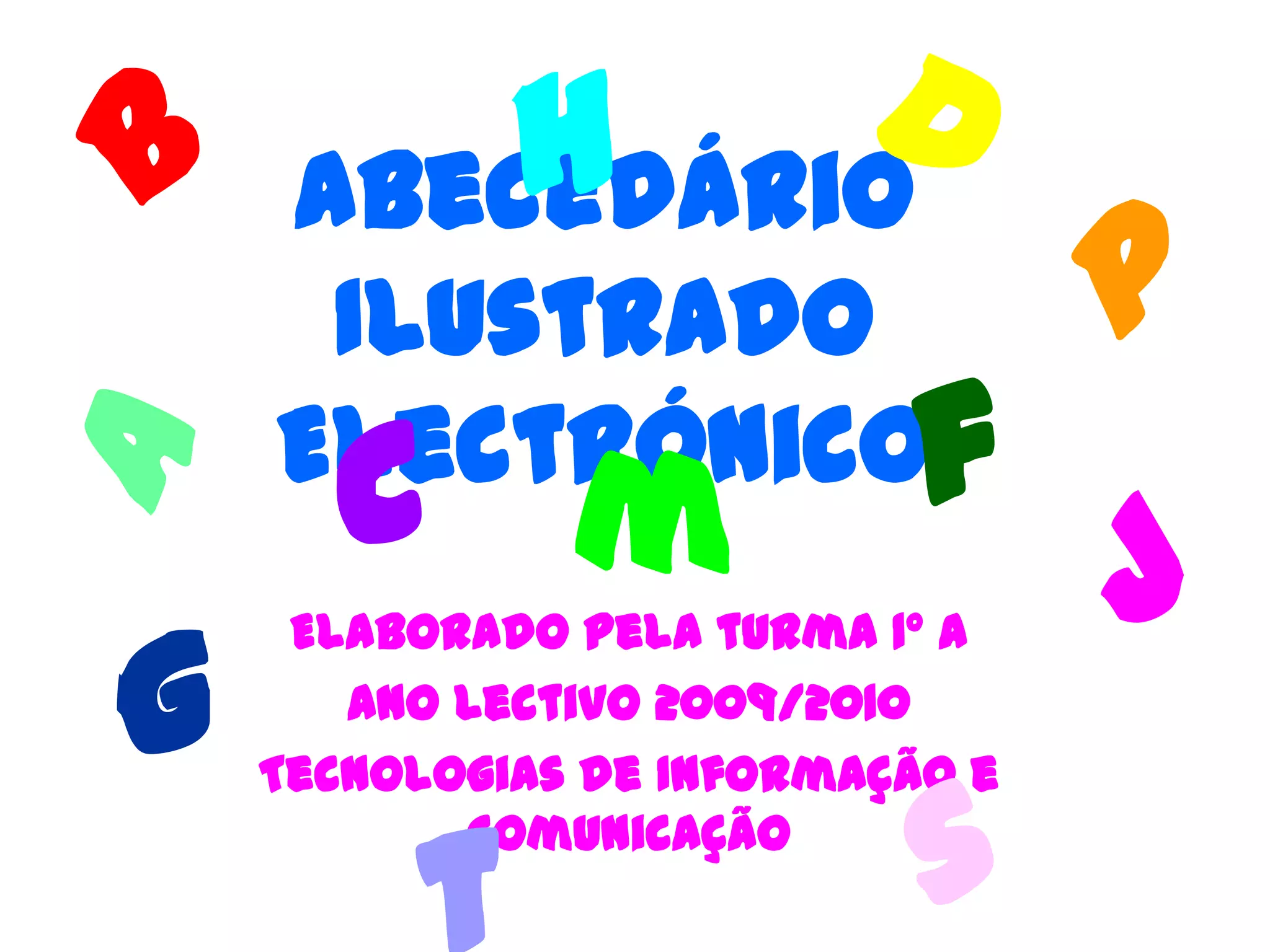 O documento apresenta um abecedário ilustrado desenvolvido pela turma do 1º ano do ano letivo 2009/2010. Ele integra tecnologias de informação e comunicação. O abecedário é composto por ilustrações e conteúdos relacionados ao aprendizado das letras.
