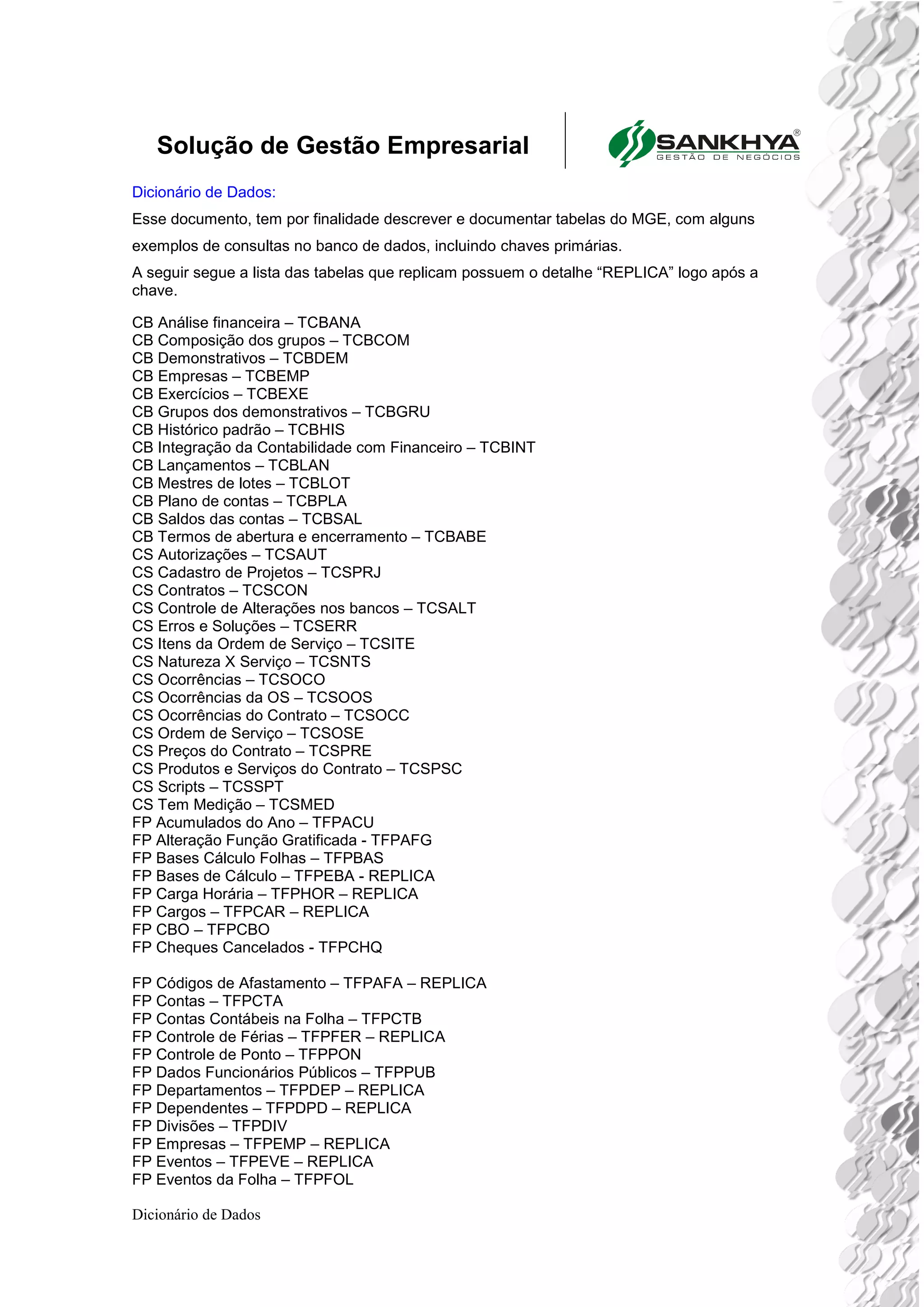 Este documento descreve tabelas de uma solução de gestão empresarial, incluindo exemplos de consultas e chaves primárias. São listadas mais de 100 tabelas dos módulos de análise financeira, compras, recursos humanos, contabilidade e sistema, entre outros.