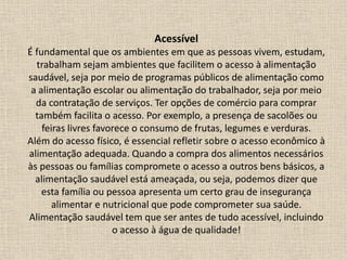 O documento discute a importância de respeitar o hábito alimentar das pessoas, que é construído ao longo da vida e influenciado por diversos fatores. Alguns hábitos são mais fáceis de mudar do que outros, mas é possível incorporar novos hábitos ou misturar hábitos antigos com novos. As práticas alimentares, que incluem os alimentos escolhidos e a forma de se alimentar, podem se modificar continuamente ao longo da vida de uma pessoa.