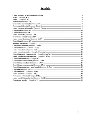 O documento apresenta um dicionário de acordes para violão e guitarra com mais de 1.400 acordes e inversões. Ele tem como objetivo ensinar os alunos a tocar vários estilos musicais através da compreensão dos diferentes tipos de acordes, como maiores, menores, com sétimas e nonas. O dicionário explica como formar cada acorde na guitarra.