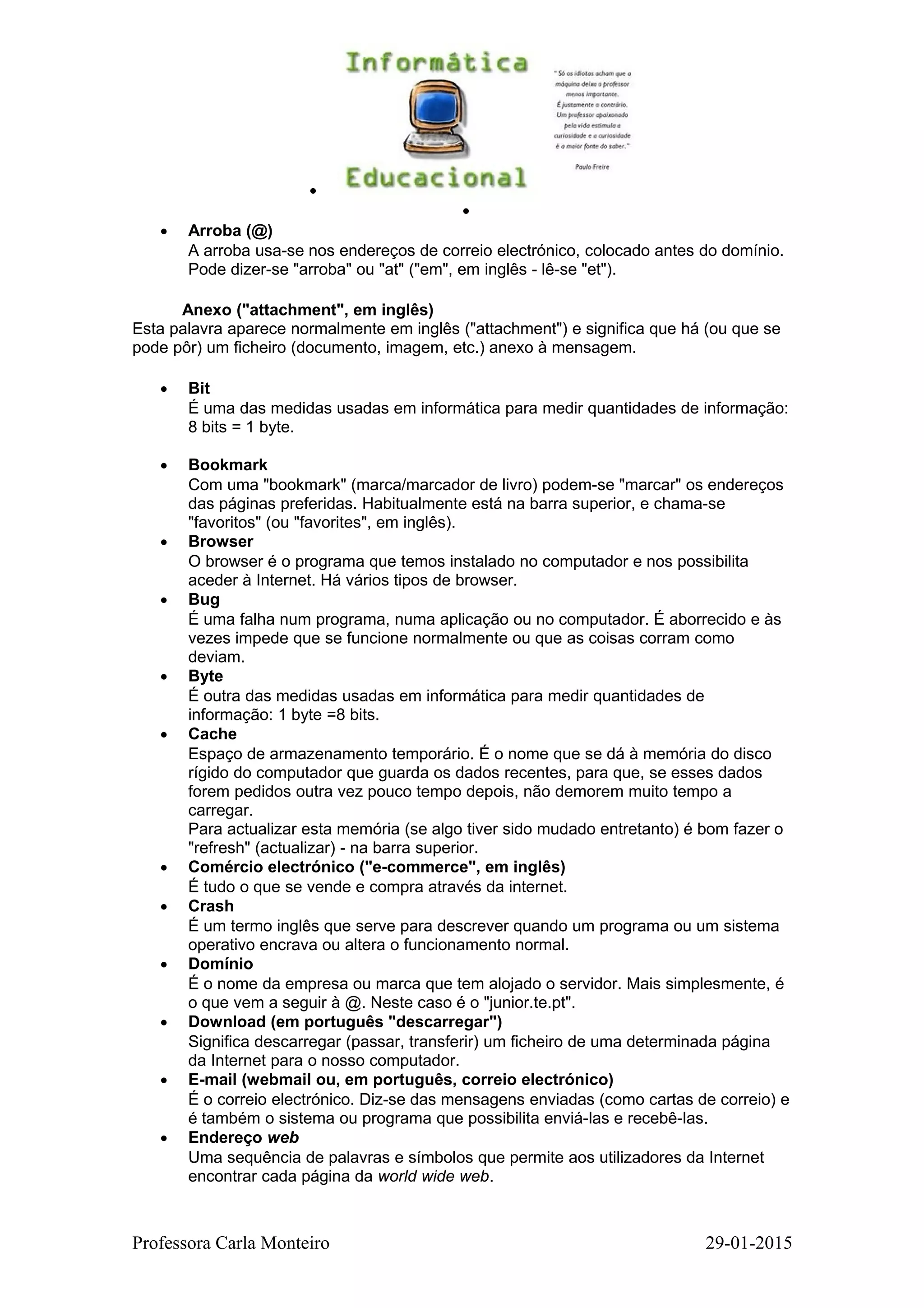 O documento define e explica termos técnicos relacionados à internet e computadores. Algumas das definições incluem: a arroba (@) é usada em endereços de email antes do domínio; anexo refere-se a arquivos incluídos em mensagens de email; e um byte é uma unidade de medida de informação digital equivalente a 8 bits.