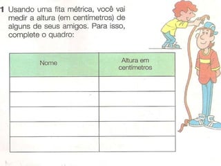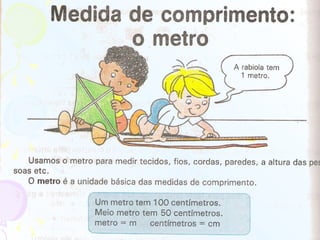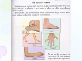 O documento fornece dicas e sugestões para ensinar medidas de comprimento para crianças, incluindo usar partes do corpo para medir, fazer uma fita métrica, medir objetos da escola e desenhar plantas baixas. Também discute a evolução dos sistemas de medidas e a importância do Sistema Internacional de Unidades.