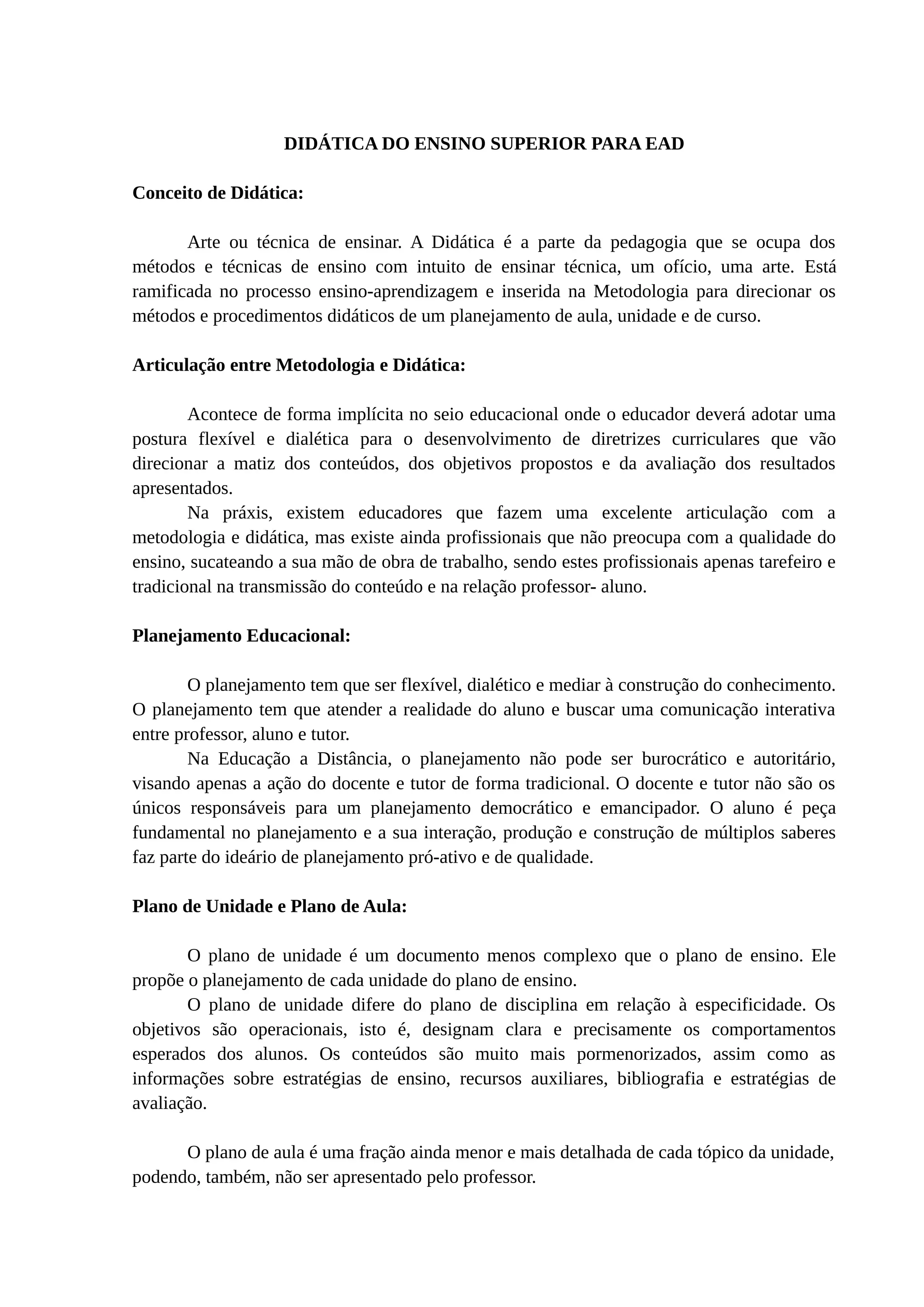 O documento discute conceitos e métodos de didática e ensino a distância, incluindo: 1) a definição de didática como arte de ensinar e sua relação com metodologia; 2) a importância do planejamento educacional considerar a realidade do aluno; 3) os planos de unidade e aula como ferramentas para detalhar os objetivos e conteúdos; 4) as ferramentas interativas síncronas e assíncronas para facilitar a comunicação a distância.