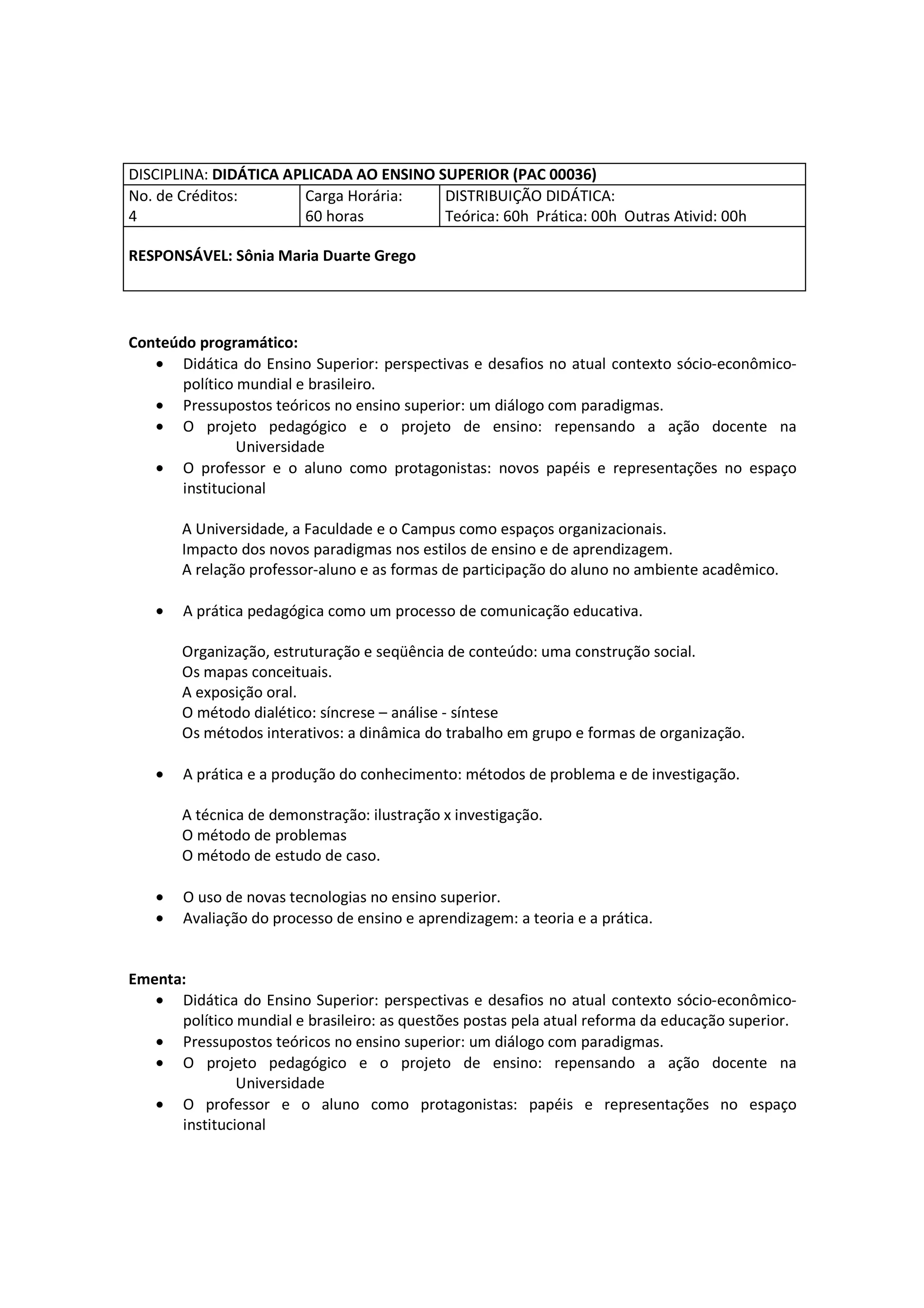 Este documento descreve uma disciplina de Didática Aplicada ao Ensino Superior. A disciplina tem 4 créditos e 60 horas de carga horária, cobrindo tópicos como didática no ensino superior, projetos pedagógicos, novas tecnologias e avaliação. Os objetivos são analisar papéis de professores e alunos, refletir sobre ensino universitário e utilizar metodologias que desenvolvam pensamento crítico. A avaliação inclui leituras, participação e projetos individuais e em grupo.