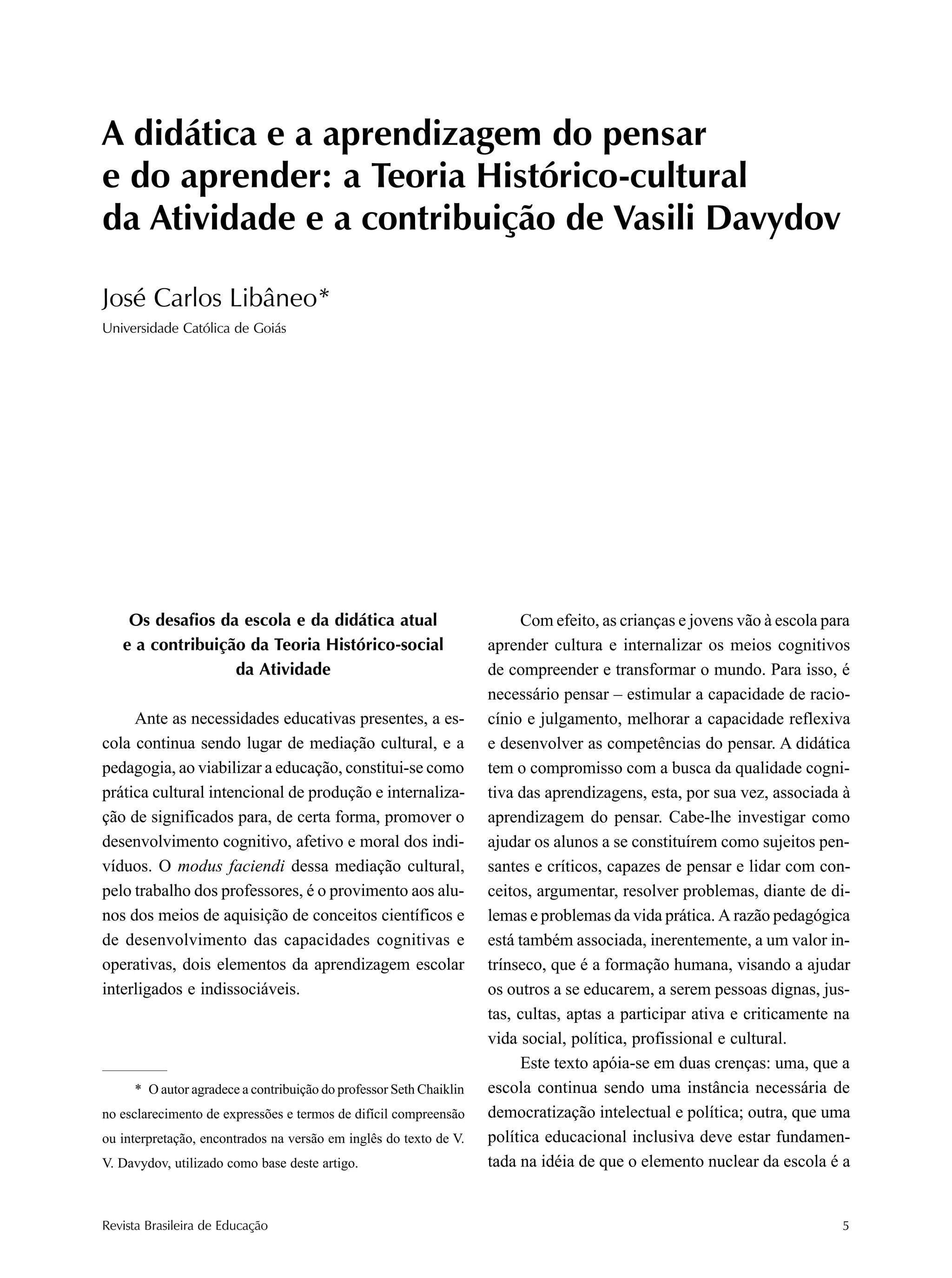 O documento discute a importância de se ensinar o pensamento crítico e habilidades cognitivas na escola. A Teoria Histórico-Cultural da Atividade defende que a aprendizagem ocorre através da internalização da cultura e dos meios cognitivos da sociedade. Isso requer estimular a capacidade de raciocínio dos alunos e ajudá-los a pensar e lidar com conceitos.