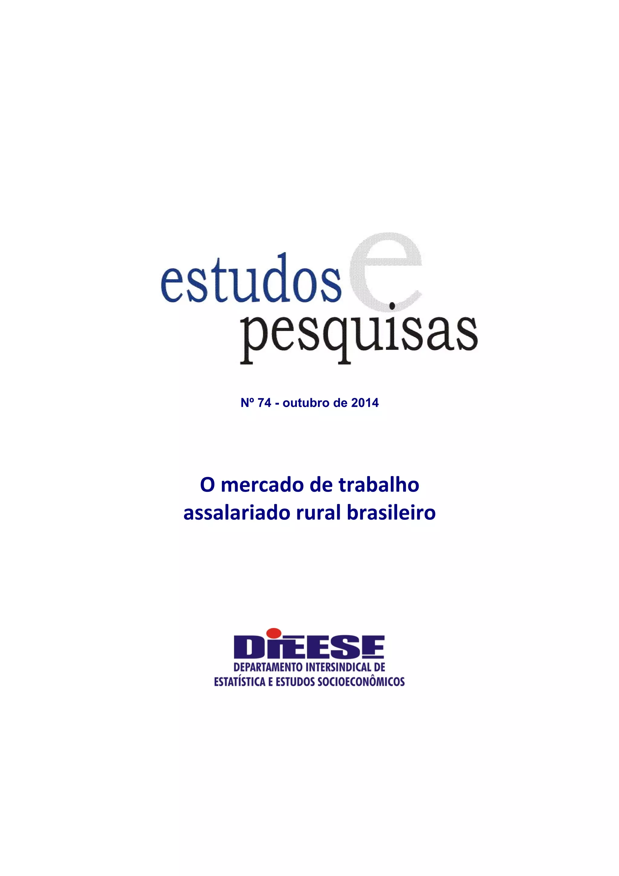 Este documento analisa o mercado de trabalho assalariado rural brasileiro. A população rural vem diminuindo ao longo dos anos devido à mecanização da agricultura e migração para áreas urbanas. O número de trabalhadores rurais assalariados caiu de 4,9 milhões em 2004 para 4 milhões em 2013. A ocupação rural tem diminuído com a especialização da produção agrícola e o aumento da produtividade por máquinas.