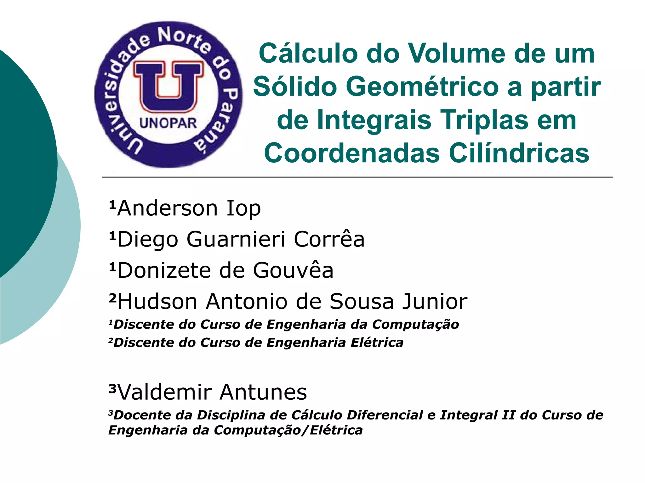 Este documento apresenta a dedução da fórmula do volume de um cone e de um tronco de cone a partir de integrais triplas em coordenadas cilíndricas. Primeiro deduz a fórmula do volume de um cone circular reto como πR2H/3 e depois generaliza para o volume de um tronco de cone como πR2(H-hB)/3, onde R é o raio, H a altura total e hB a altura da base do tronco. Por fim, aplica as fórmulas ao cálculo do volume de um sól