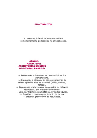 Este documento descreve as atividades realizadas durante um estágio de prática docente na Escola Municipal de Ensino Fundamental Pompílio Almeida Neves com alunos do 1o e 2o ano do ensino fundamental. As atividades se basearam nas histórias do Sítio do Picapau Amarelo de Monteiro Lobato e abordaram tópicos como personagens, números, artesanato, geografia e educação física. O relatório final reflete sobre a importância de conectar o conteúdo ao interesse e à realidade das crianças.