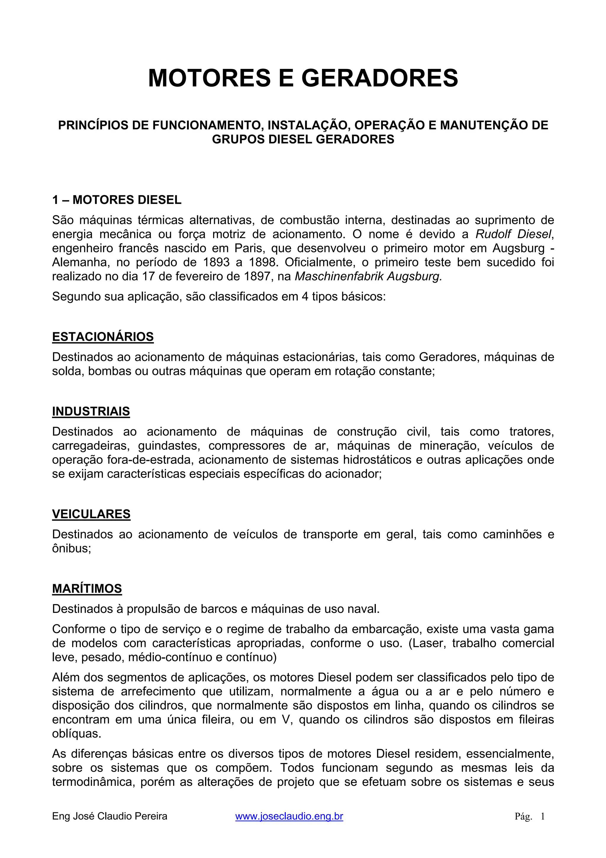 O documento descreve os princípios básicos de funcionamento, classificação e sistemas de motores diesel. Explica que são máquinas térmicas que convertem energia do combustível em energia mecânica através da combustão interna do óleo diesel. Descreve os quatro tempos do ciclo diesel: admissão, compressão, combustão e escape. Também lista e define os principais componentes e sistemas dos motores diesel.