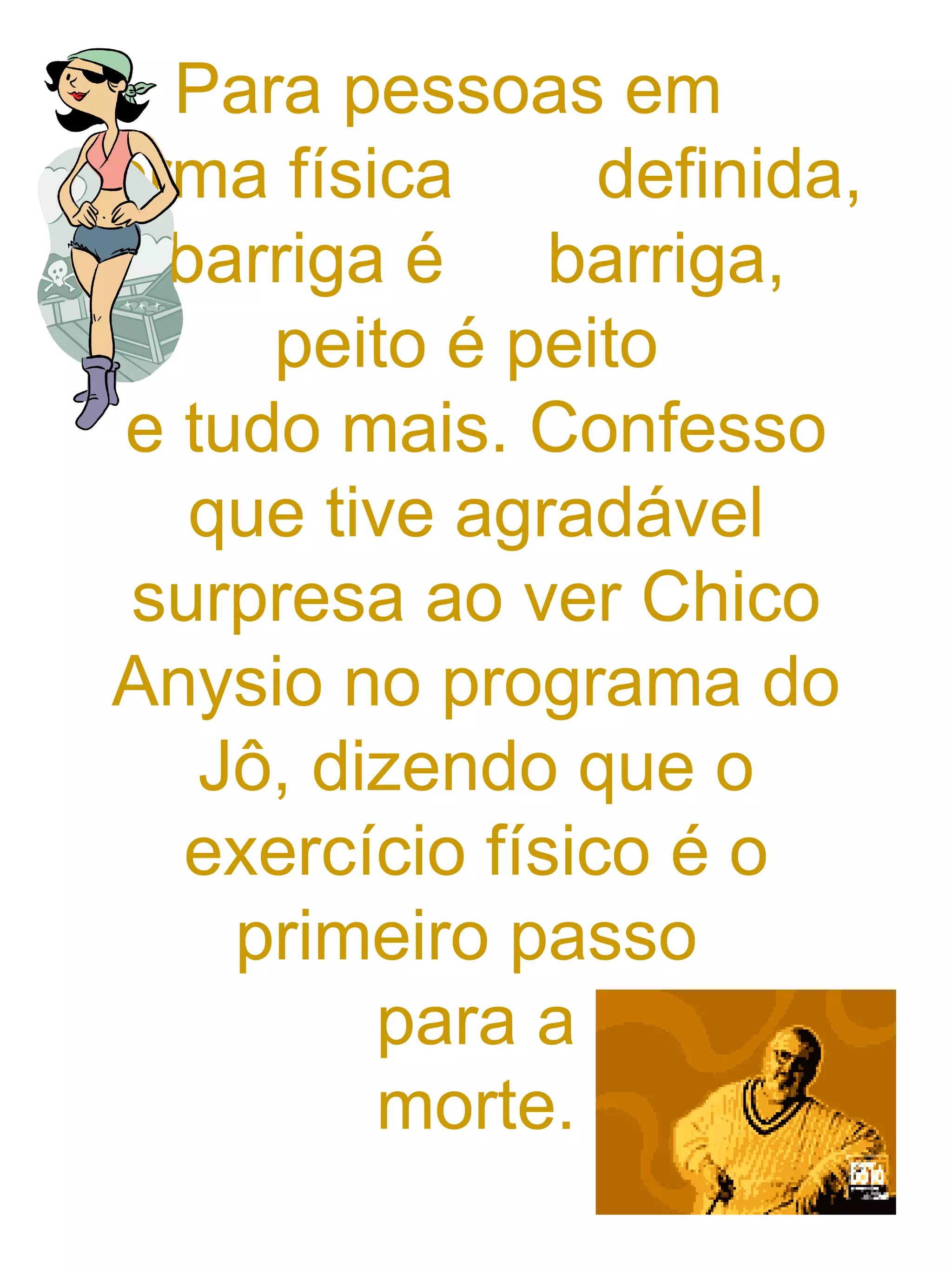 O documento resume a opinião de Chico Anysio de que exercício físico não é necessário para uma vida longa, citando exemplos de pessoas longevas que eram sedentárias, como o jurista Barbosa Lima Sobrinho e o compositor Dorival Caymmi. Conclui encorajando o sedentarismo e criticando dietas, notando que até baleias, apesar de nadarem o dia todo, permanecem gordas.
