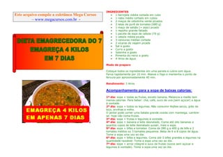 Este documento fornece uma receita de sopa de baixas calorias e um plano de 7 dias de acompanhamentos para a sopa, incluindo frutas, legumes e proteínas como bifes para ajudar na perda de peso.