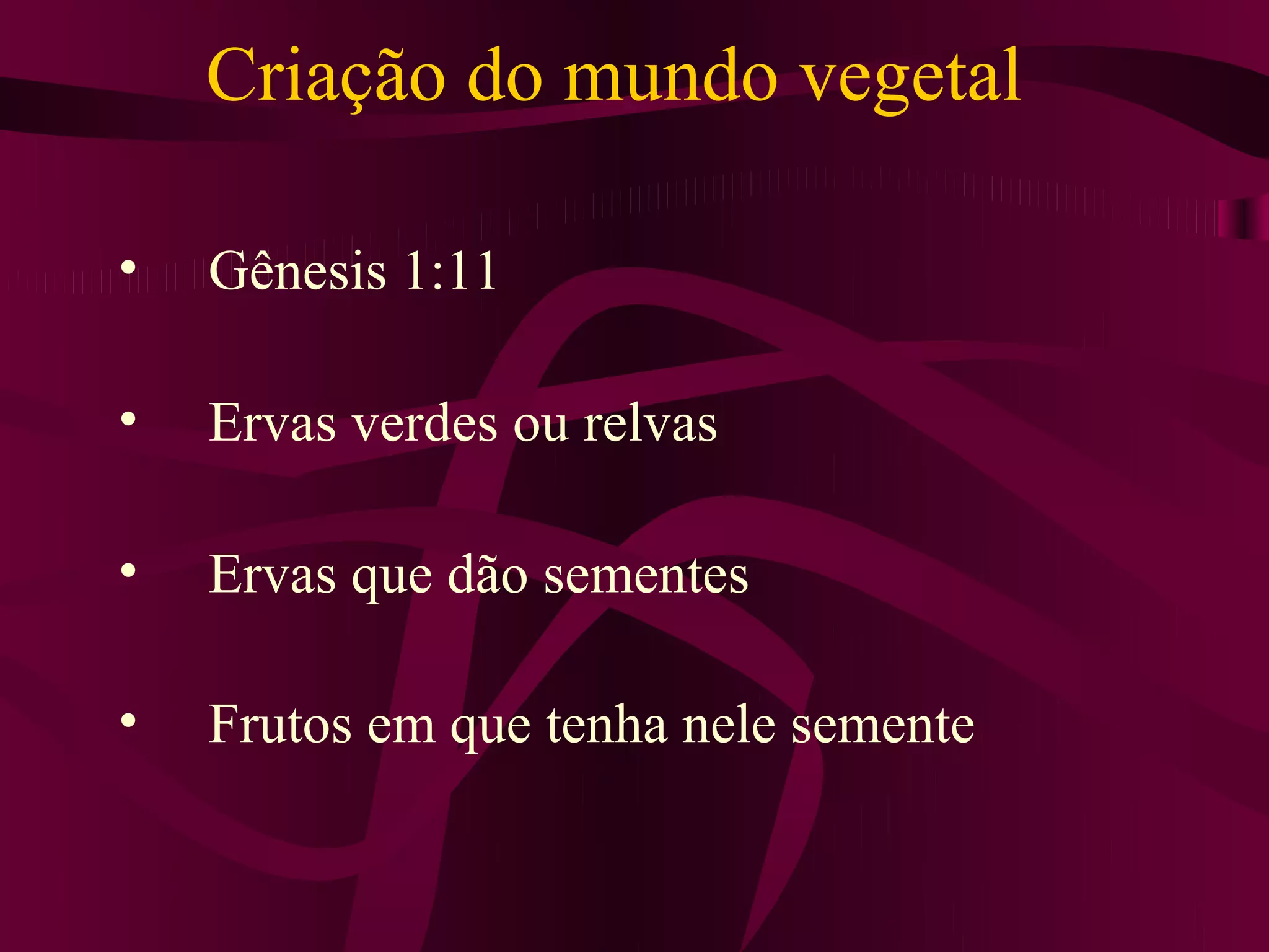 O documento descreve a criação do mundo vegetal segundo o relato bíblico no Gênesis, incluindo a criação das ervas verdes, ervas que dão sementes e frutos. Também aborda a dieta no Éden, pós-Éden, após o dilúvio e da dieta israelita, além de fontes de cálcio e a dieta moderna.