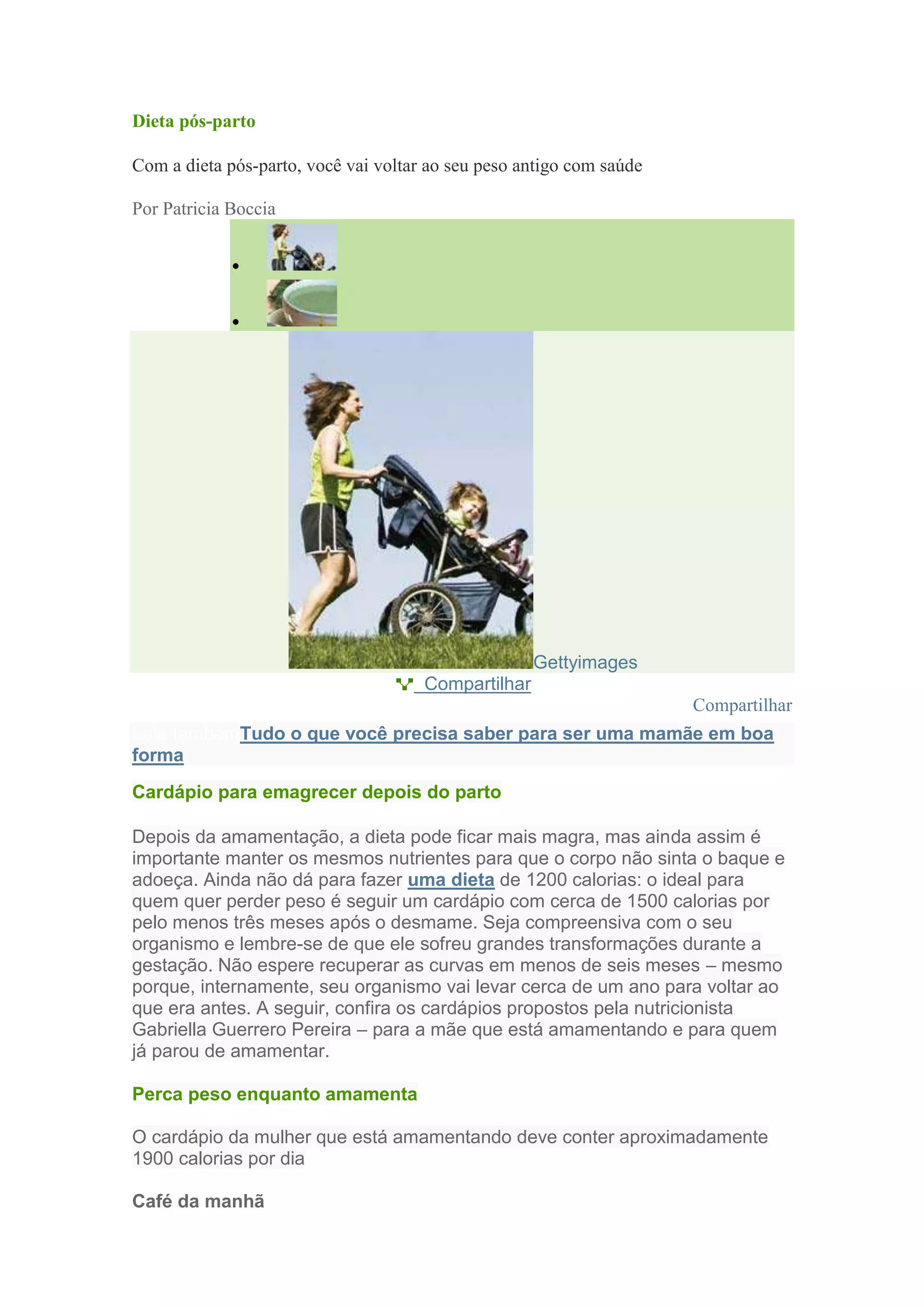 O documento fornece cardápios para dieta pós-parto, distinguindo entre mulheres que estão amamentando e que já pararam de amamentar. Os cardápios incluem refeições leves e saudáveis com quantidades adequadas de calorias para auxiliar no retorno ao peso pré-gestacional de forma saudável.