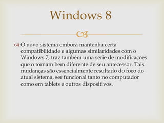 O documento descreve as principais mudanças trazidas pelo Windows 8 em relação ao Windows 7. O Windows 8 introduz uma nova tela inicial projetada para dispositivos touchscreen e tablets, altera a forma como o menu iniciar funciona, e melhora o desempenho e gráficos sem alterar significativamente o ambiente de trabalho. Embora traga vantagens como interface touchscreen e aplicativos, o Windows 8 também apresenta desvantagens como um formato gráfico menos adequado para uso doméstico e maior complexidade.