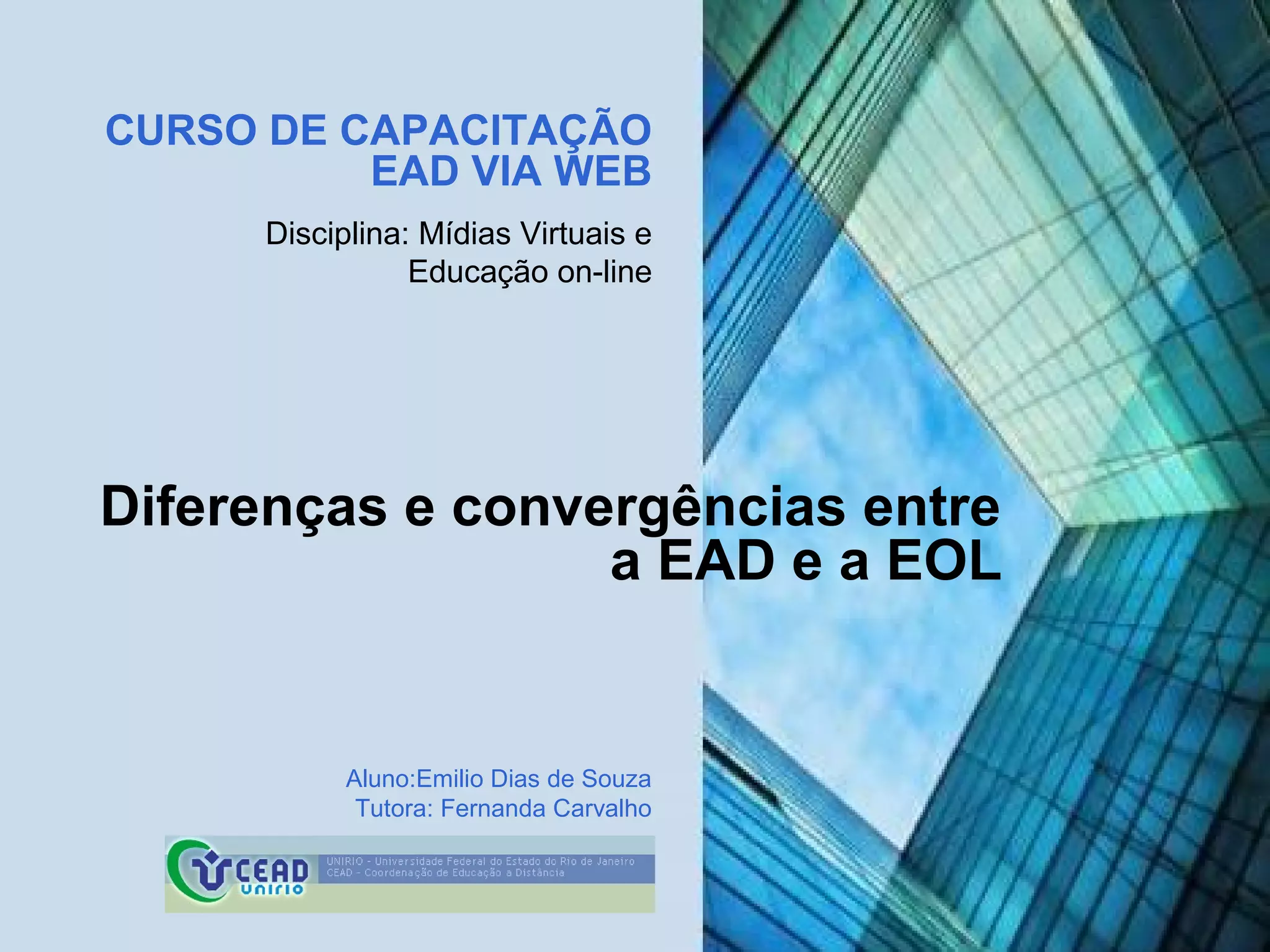 (1) O documento discute as diferenças e convergências entre Educação a Distância (EAD) e Educação On-line (EOL); (2) A EAD envolve ensino não presencial através de meios como impressos, rádio, TV e vídeo; (3) A EOL se refere à EAD realizada online de forma síncrona ou assíncrona por meio de ferramentas de comunidades virtuais.