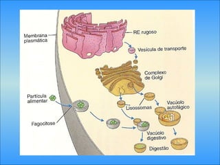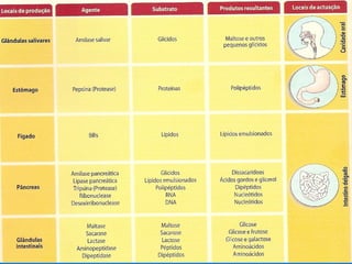 O documento descreve os processos de ingestão, digestão e absorção em diferentes organismos. A digestão pode ocorrer intracelularmente, como nas amibas, ou extracelularmente, como nos cogumelos. Nos animais, a digestão é geralmente intracorporal em tubos digestivos completos ou incompletos.