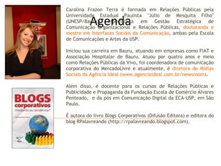 O documento apresenta uma agenda para um curso sobre planejamento de comunicação aplicado às redes sociais online. A agenda inclui conceitos de redes sociais e planejamento de comunicação, análise de casos, objetivos de aprendizagem e metodologia do curso com leituras e referências bibliográficas.