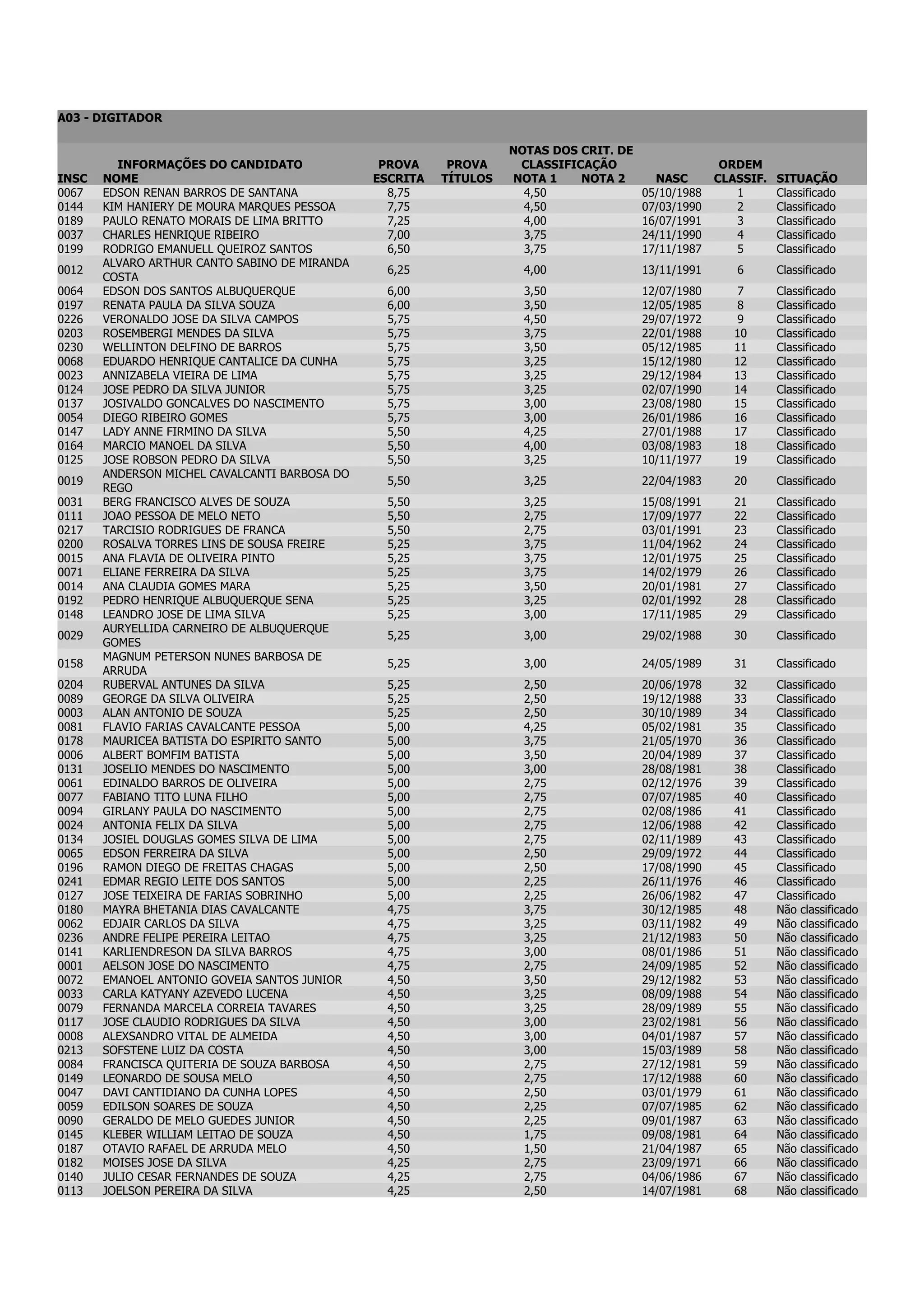 Este documento apresenta os resultados de uma prova para o cargo de digitador. Nele constam os nomes e notas dos candidatos, bem como sua classificação e situação (classificado ou não classificado). O candidato Edson Renan Barros de Santana obteve a maior nota e ficou em primeiro lugar.