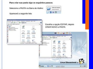 O documento descreve a importância da educação digital e das tecnologias de informação e comunicação (TICs) no contexto do sistema operacional Linux Educacional. Ele discute como o computador funciona através do sistema operacional e aplicativos, e enfatiza a criação de pastas pessoais para armazenamento de arquivos pelo usuário.