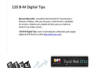 O documento fornece 30 dicas e 90 razões para empresas usarem mídias sociais na América Latina. As dicas incluem ouvir públicos, planejar estratégias com todas as áreas da empresa, medir resultados com métricas, e envolver influenciadores. As razões destacam o grande número de usuários latino-americanos nas mídias, a importância do engajamento com consumidores, e a necessidade de monitorar conversas online sobre marcas.