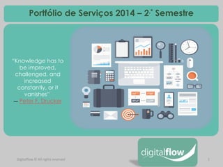 Este documento apresenta o portfólio de serviços da Digitalflow para o 2o semestre de 2014, incluindo seminários, workshops e consultoria nas áreas de Procurement e Inovação Empresarial. Detalha uma proposta de valor baseada no desenvolvimento de boas práticas nestas áreas, workshops práticos interempresas e in-company, e consultoria personalizada. Inclui também um calendário com as datas previstas para os eventos do semestre.