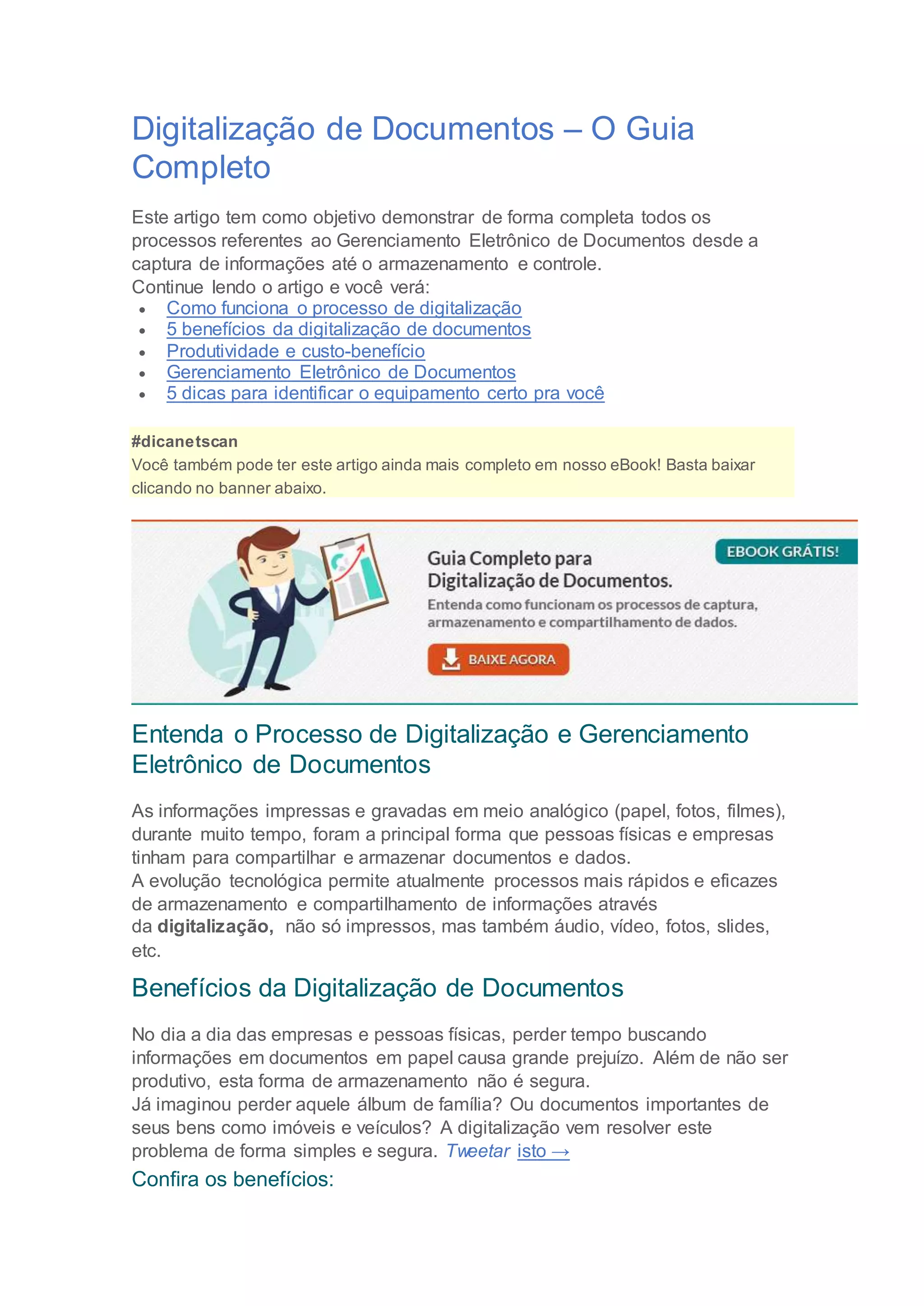 O documento discute o processo de digitalização de documentos, incluindo: 1) como funciona o processo de digitalização; 2) os benefícios da digitalização como segurança, acesso rápido e redução de custos; 3) o Gerenciamento Eletrônico de Documentos para organização e armazenamento digital.