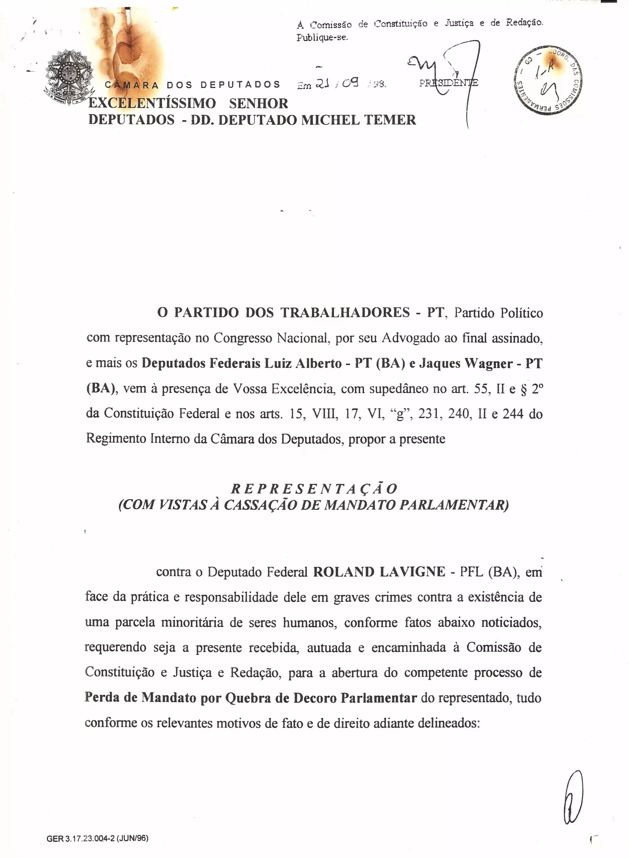 O documento é uma representação contra o deputado federal Roland La Vigne do PFL da Bahia pedindo a cassação do seu mandato parlamentar por quebra de decoro. A representação alega que o deputado cometeu graves crimes contra uma parcela minoritária de seres humanos e pede que o caso seja encaminhado à Comissão de Constituição e Justiça para a abertura de um processo de perda de mandato.