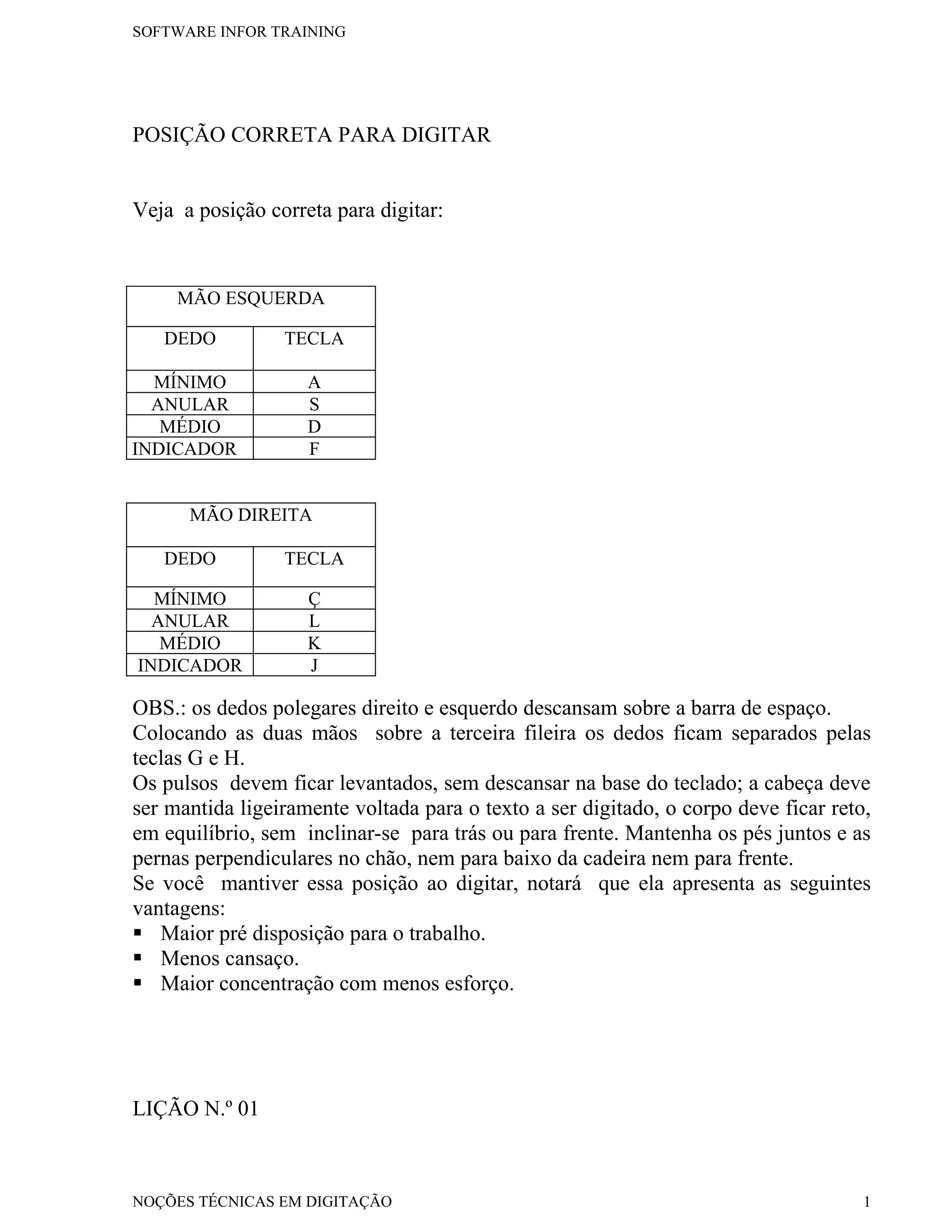 O documento fornece instruções sobre a posição correta das mãos no teclado e exercícios iniciais de digitação das letras A, E, I, O e U, incluindo recomendações como manter os pulsos levantados e a cabeça voltada para o texto. Os exercícios pedem para digitar cada letra 10 vezes com foco na contração e relaxamento dos dedos.