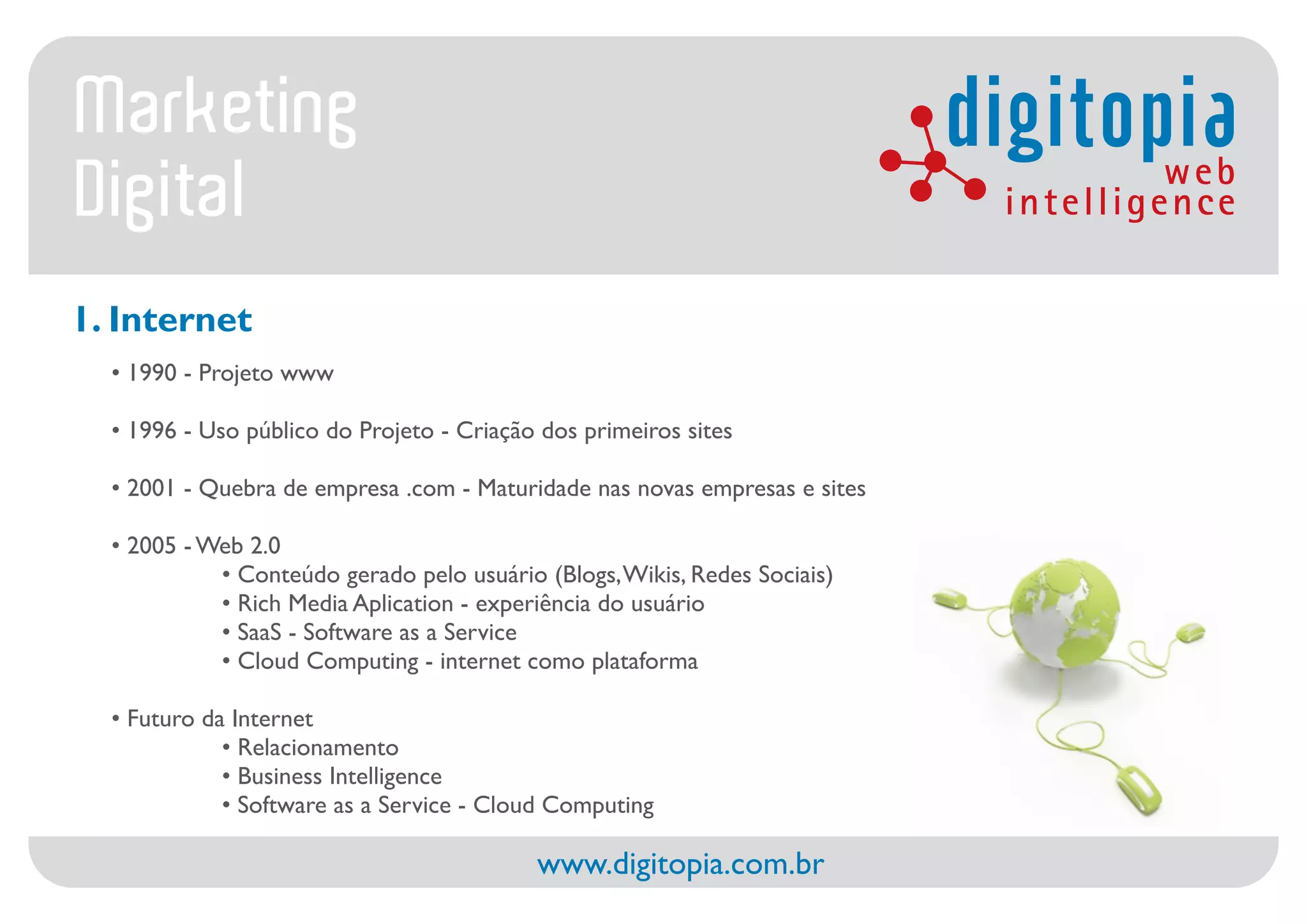 O documento discute o marketing digital, incluindo a história da internet, as razões para fazer marketing digital, diferentes ações de marketing digital como SEO e mídias sociais, como os mecanismos de busca funcionam e a importância da web analytics para medir os resultados de campanhas.