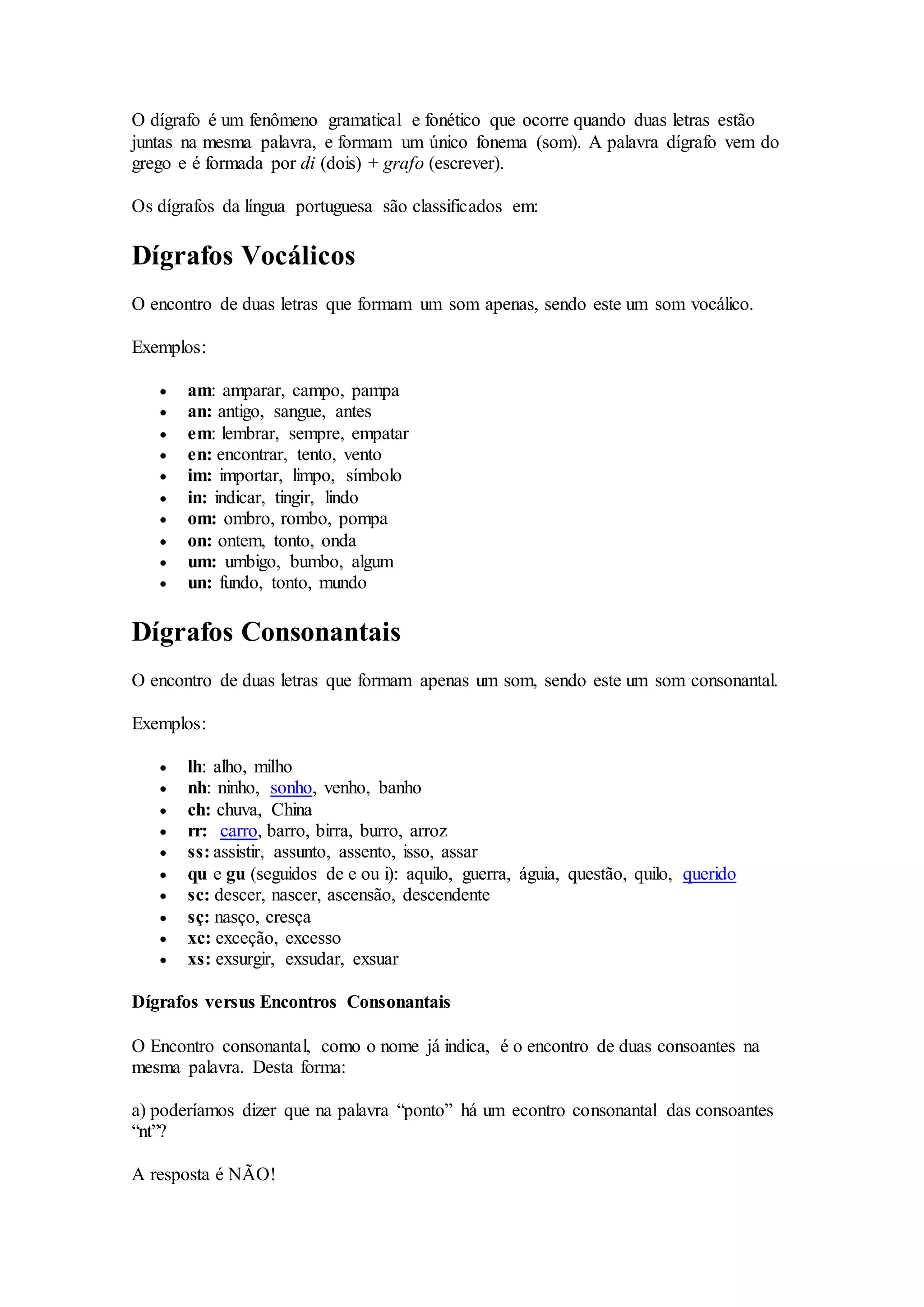 O documento discute os dígrafos na língua portuguesa, que são formados por dois grafemas representando um único fonema. São classificados em vocálicos, como "am" e "on", e consonantais, como "nh" e "rr". Também diferencia dígrafos de encontros consonantais, onde duas consoantes representam sons separados.