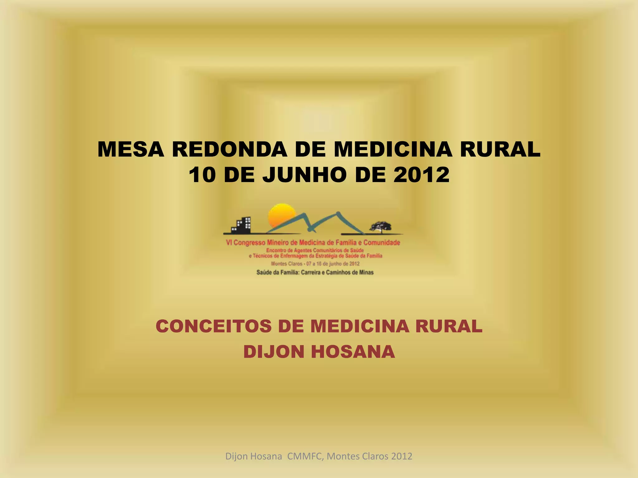 O documento apresenta uma mesa redonda sobre medicina rural, discutindo casos clínicos, definições e competências necessárias para médicos que atuam em áreas rurais. Destaca a importância dos médicos rurais para a saúde das populações, os desafios da prática e a necessidade de formação específica para lidar com as peculiaridades desse contexto. Ao final, são dadas conclusões sobre o papel estratégico dos médicos rurais e a satisfação na escolha dessa especialidade.