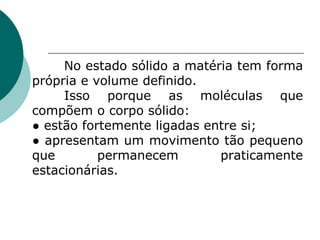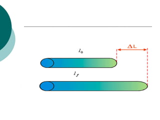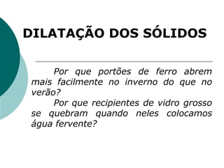 Dilatação dos sólidos ocorre quando as moléculas que compõem um corpo sólido se separam devido ao aumento de temperatura, fazendo com que o sólido aumente de volume. A dilatação pode ser linear, superficial ou volumétrica. A dilatação linear é diretamente proporcional ao comprimento original e à variação de temperatura, conforme a equação apresentada. Diferentes materiais possuem coeficientes de dilatação linear variados.