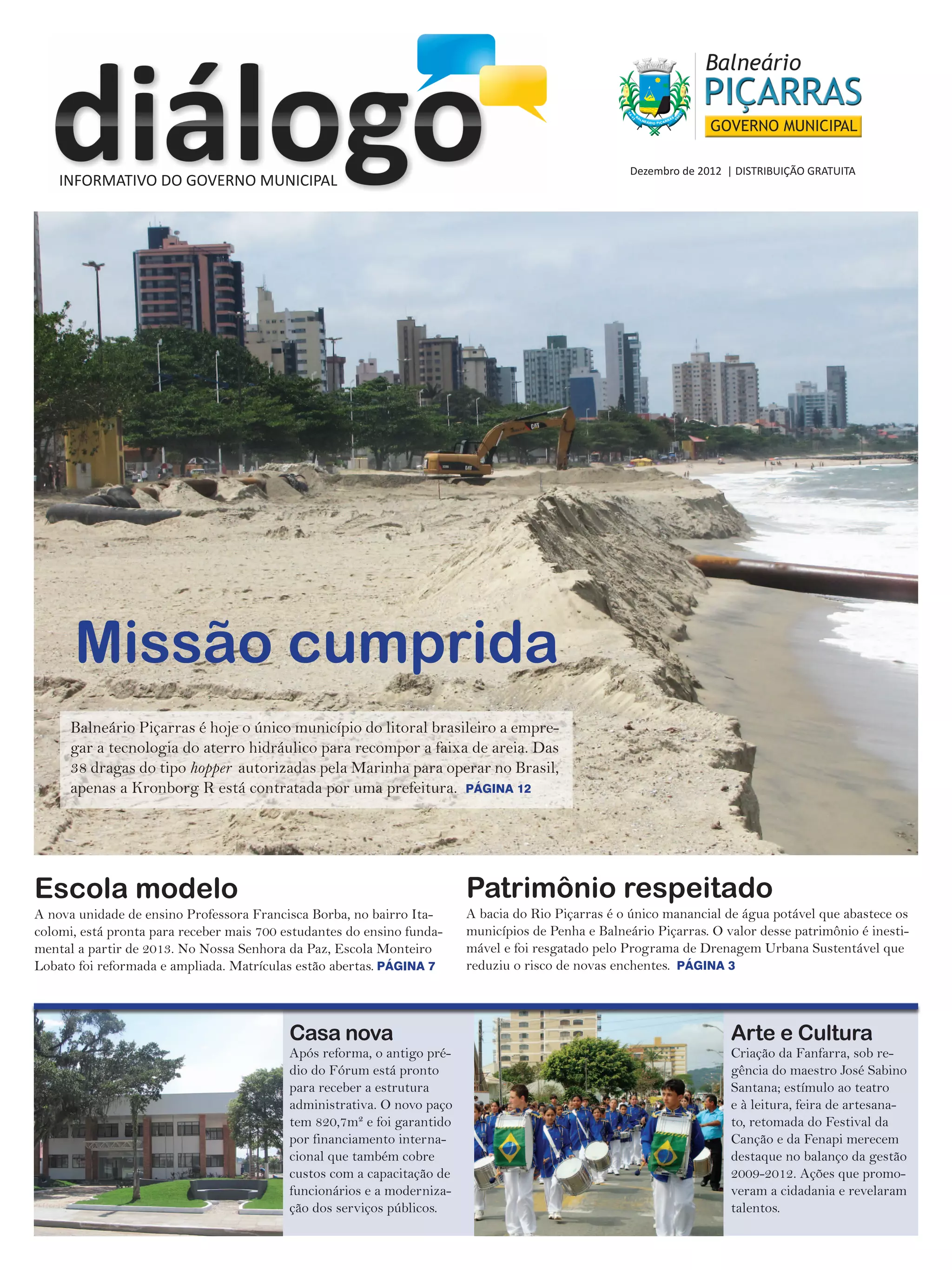 O documento descreve as ações realizadas pelo governo municipal de Balneário Piçarras para prevenir enchentes, como dragagem dos rios Piçarras e Furado, replantio de vegetação nativa e implantação de novas redes de drenagem. A obra de drenagem urbana sustentável foi concluída e inaugurada, sendo a primeira do programa PAC2 a ser finalizada, livrando 1,2 mil famílias do risco de alagamentos.