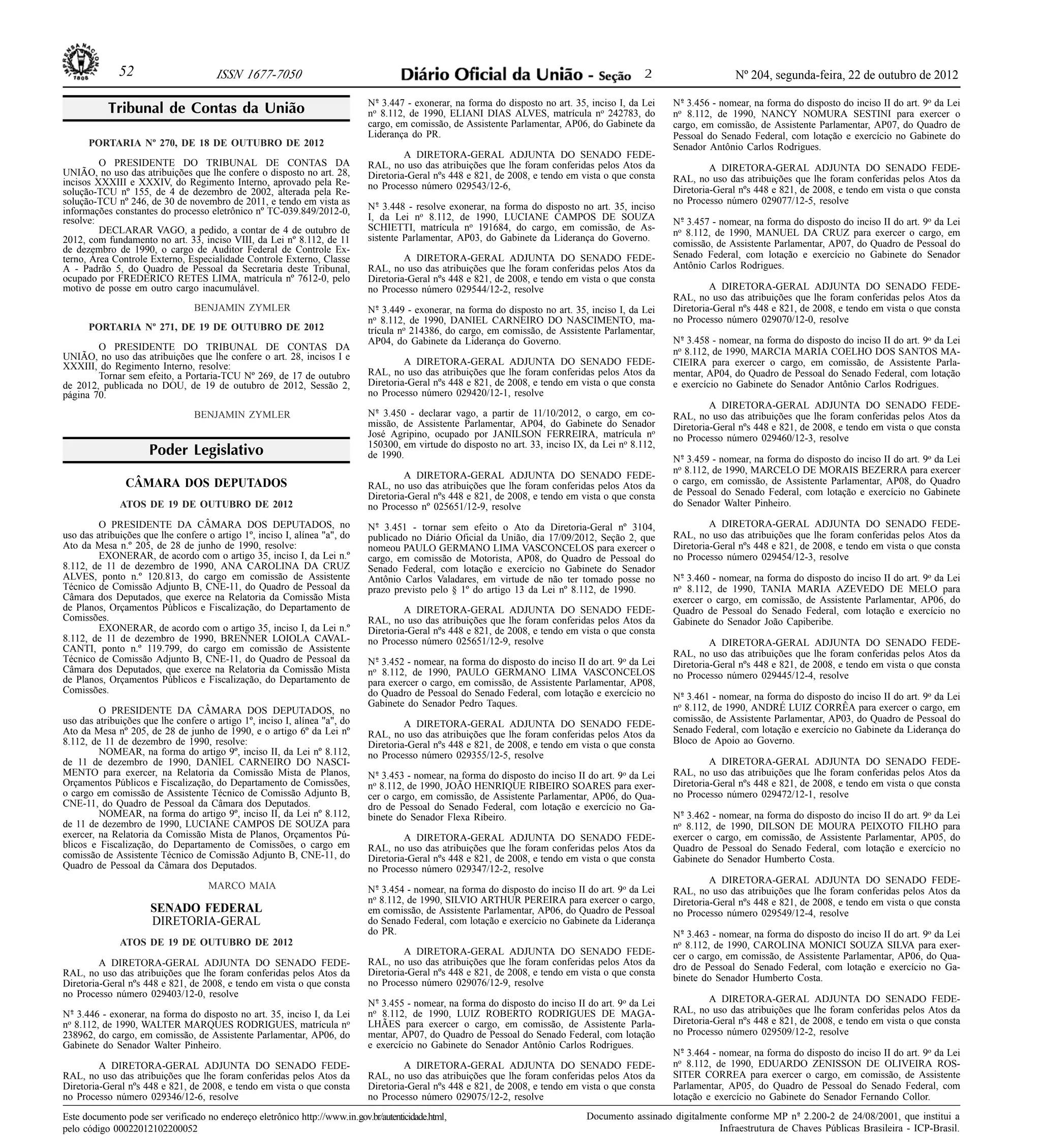 Este documento contém 462 atos da diretora-geral adjunta do Senado Federal nomeando, exonerando e declarando vagos cargos em comissão de assistentes parlamentares e motoristas no Senado. Os atos fazem parte da gestão de pessoal do Senado e movimentam funcionários entre gabinetes de senadores.