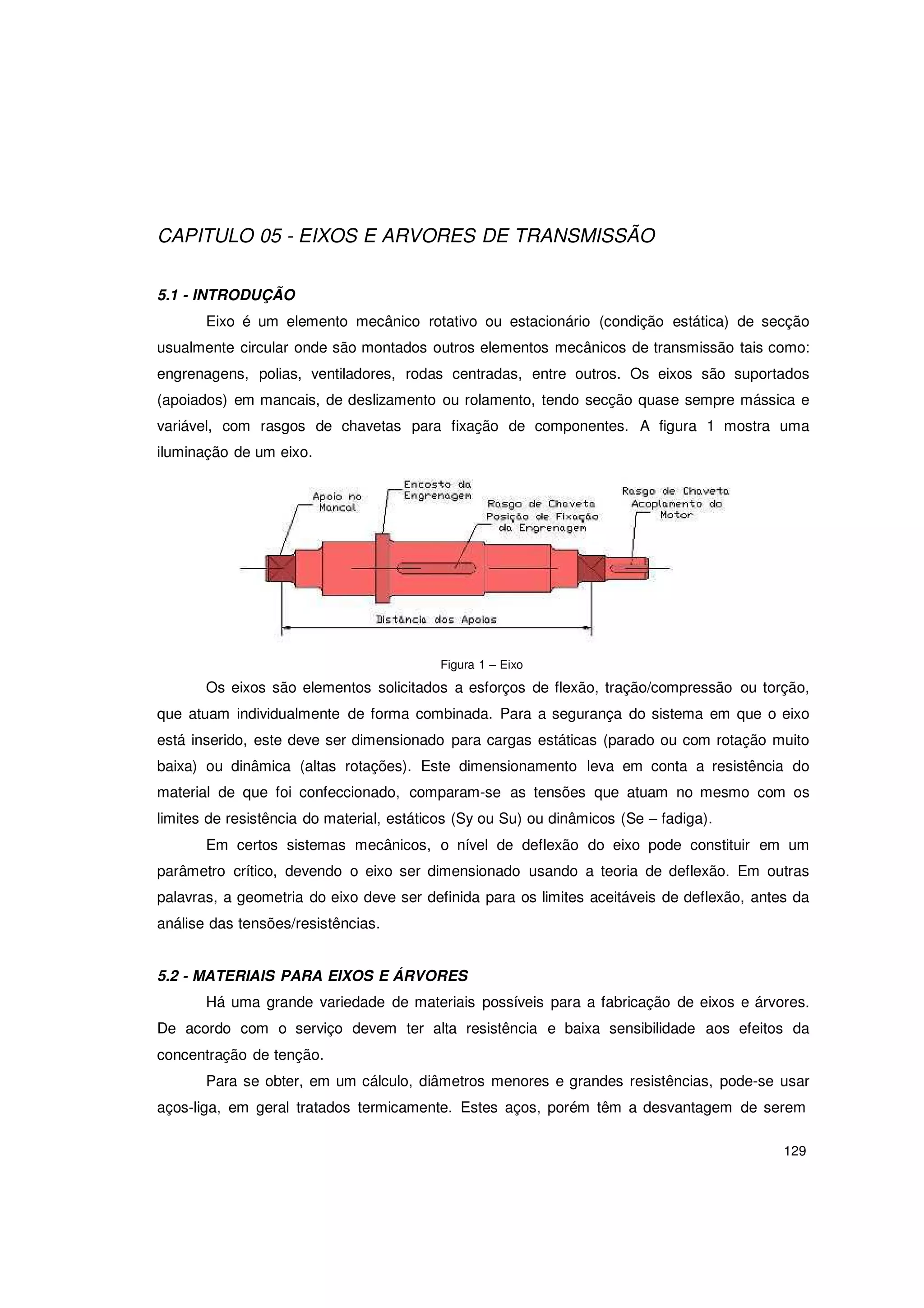 O documento discute eixos e árvores de transmissão. Apresenta fórmulas para calcular tensões em eixos sujeitos a flexão, torção e esforço axial estático. Fornece exemplos de materiais usados e características mecânicas. Resolve exercícios aplicando as fórmulas para dimensionar eixos sob carregamento estático de flexão e torção.