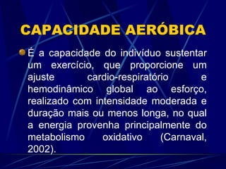 O documento discute vários aspectos da aptidão física relacionada à saúde, incluindo: 1) A capacidade aeróbica é a habilidade de sustentar exercício moderado por longos períodos através do metabolismo oxidativo; 2) A capacidade anaeróbica é sustentar alta intensidade por curtos períodos através do débito de oxigênio; 3) A flexibilidade é a amplitude de movimento das articulações e é importante para a saúde e esportes.