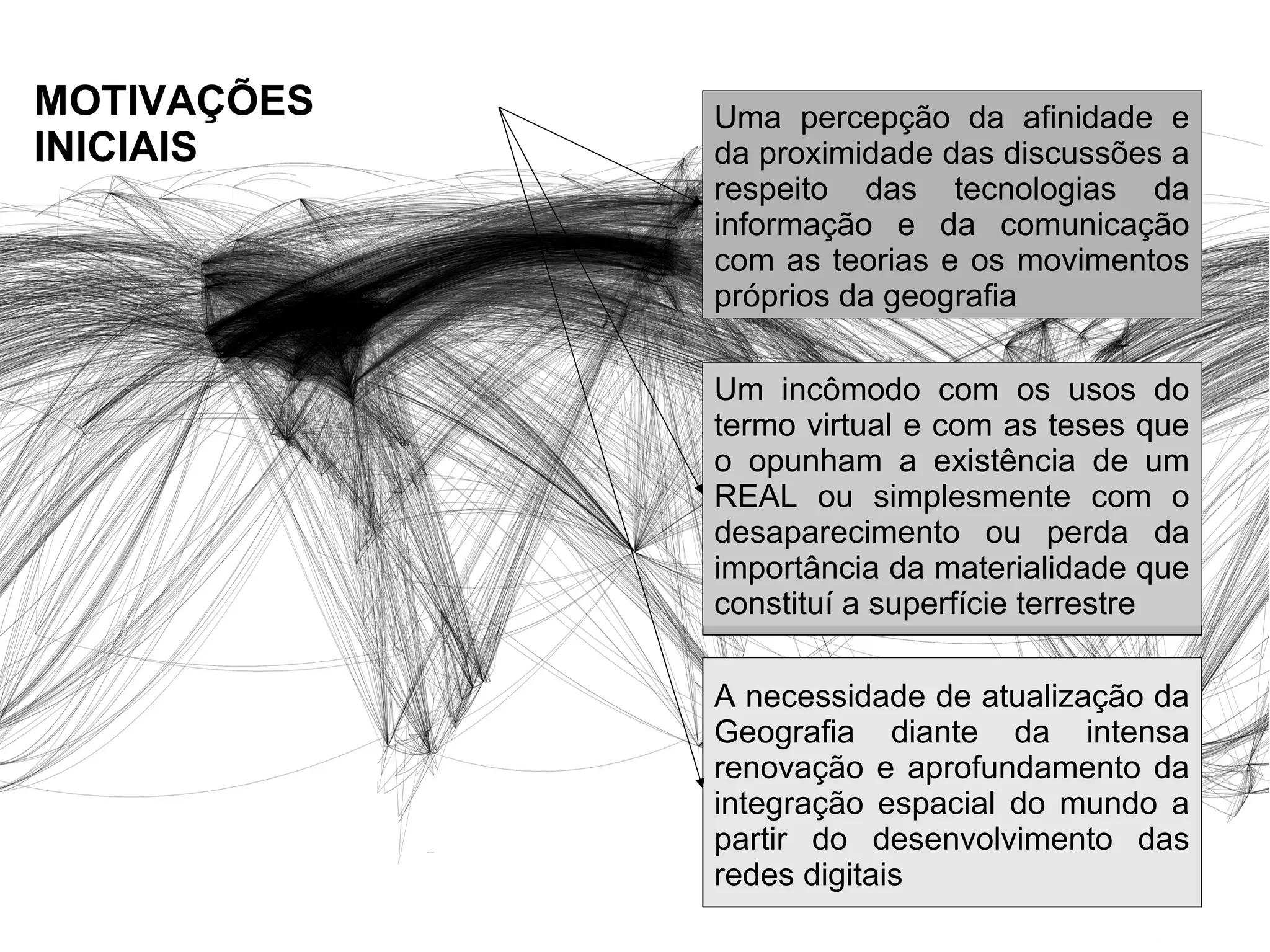O documento discute as motivações iniciais e objetivos de atualizar a geografia à luz do desenvolvimento das redes digitais. Seu objetivo é atualizar o conceito de redes na geografia e demonstrar como as redes digitais mudaram a integração espacial do mundo e criaram novos contextos geográficos.