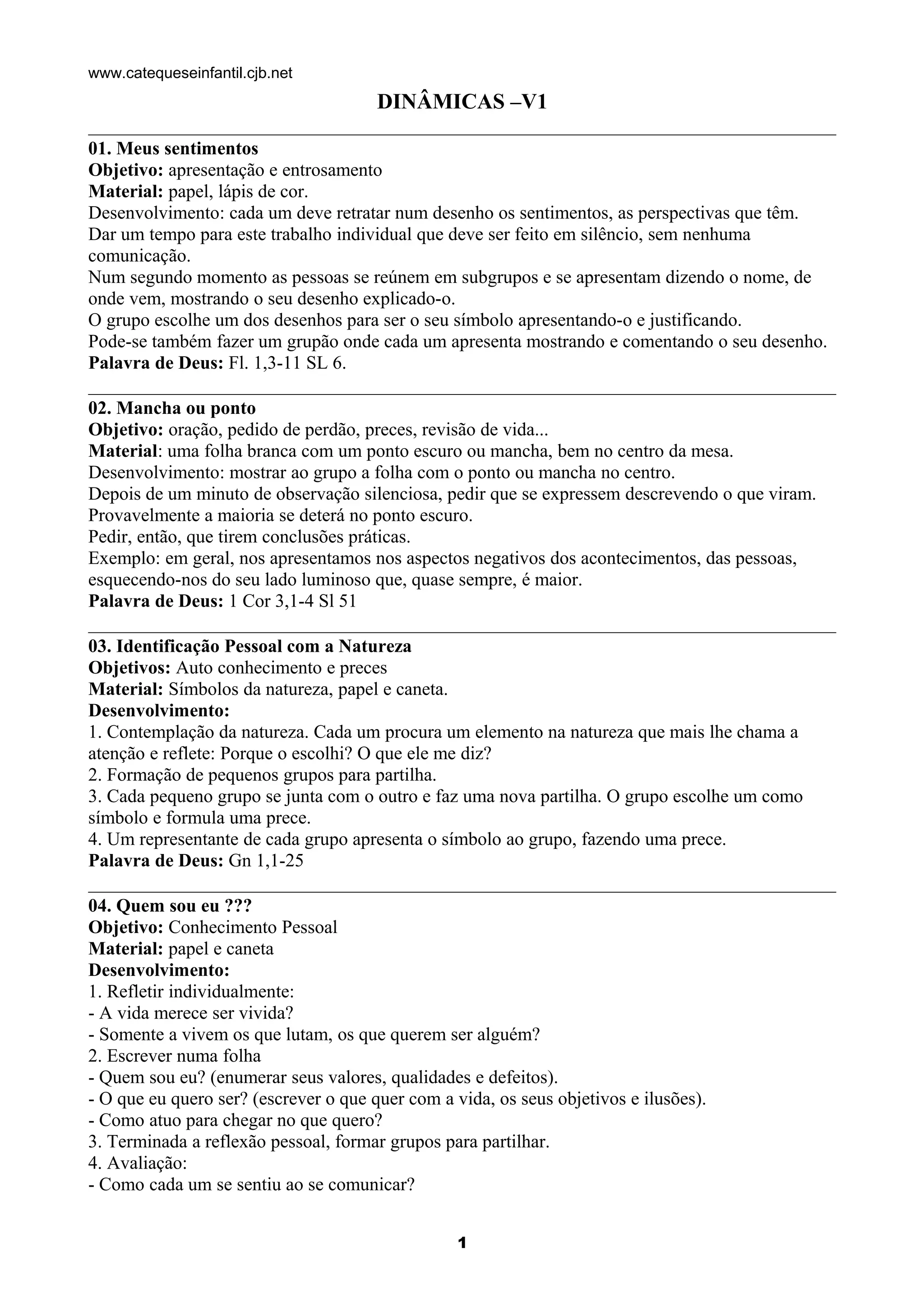 1. O documento fornece 13 dinâmicas para catequese infantil, com objetivos, materiais necessários e instruções para cada atividade.