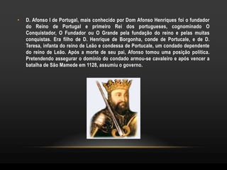A dinastia Afonso I de Portugal foi a primeira dinastia real portuguesa. Ela incluiu reis como Afonso I, o fundador de Portugal, Sancho I, o Povoador, que estimulou o povoamento do país, e Dinis I, o Lavrador, que desenvolveu a agricultura e fundou a Universidade de Coimbra. A dinastia governou Portugal de 1139 a 1383.