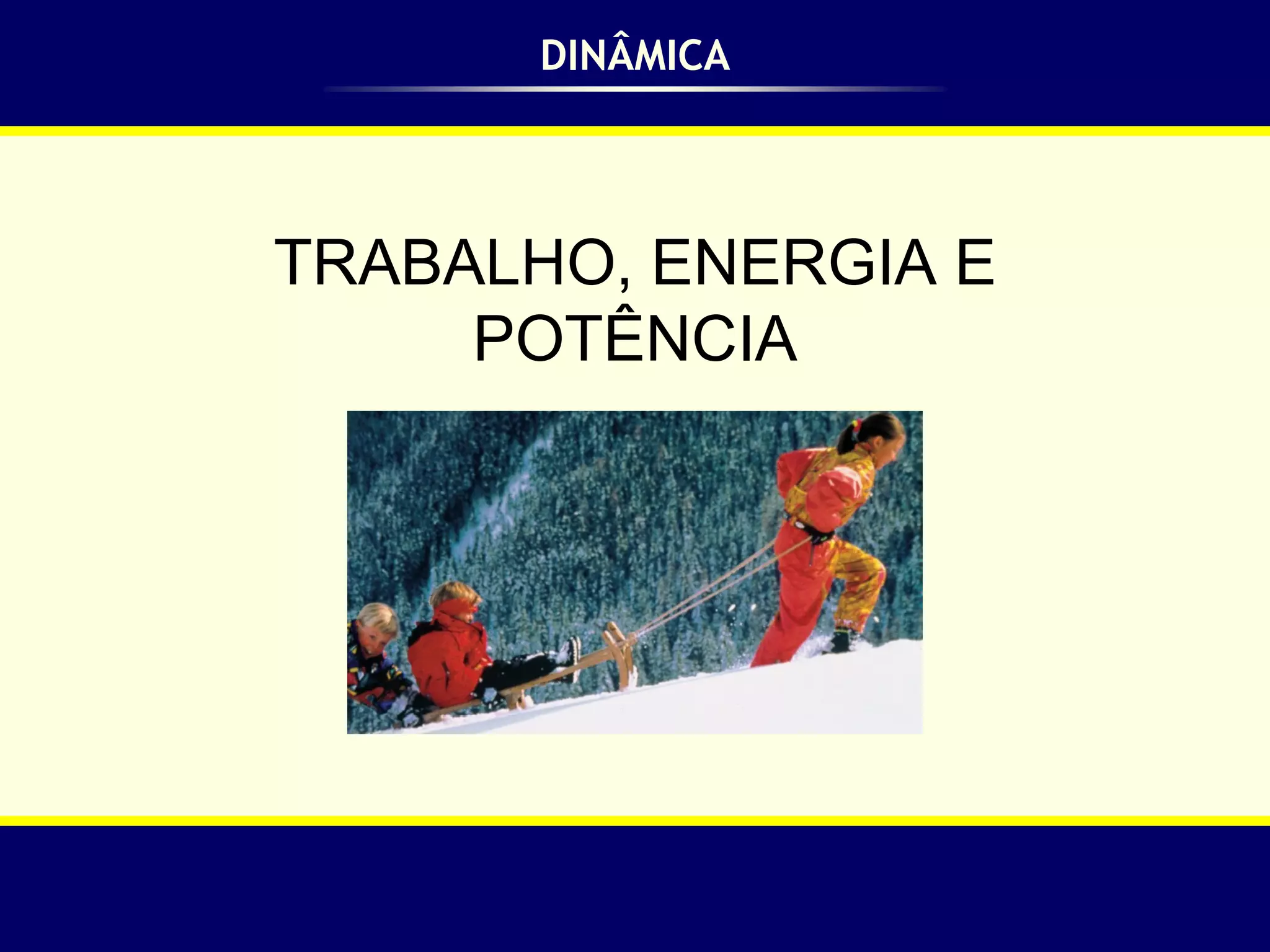 O documento discute conceitos fundamentais de trabalho, energia e potência. Ele define trabalho como a força aplicada multiplicada pelo deslocamento, medido em joules. O trabalho total é a soma dos trabalhos de cada força. O trabalho da força elástica é igual à área sob a curva de deformação. O documento também introduz a energia cinética como metade da massa multiplicada pelo quadrado da velocidade e enuncia o Teorema da Energia Cinética.