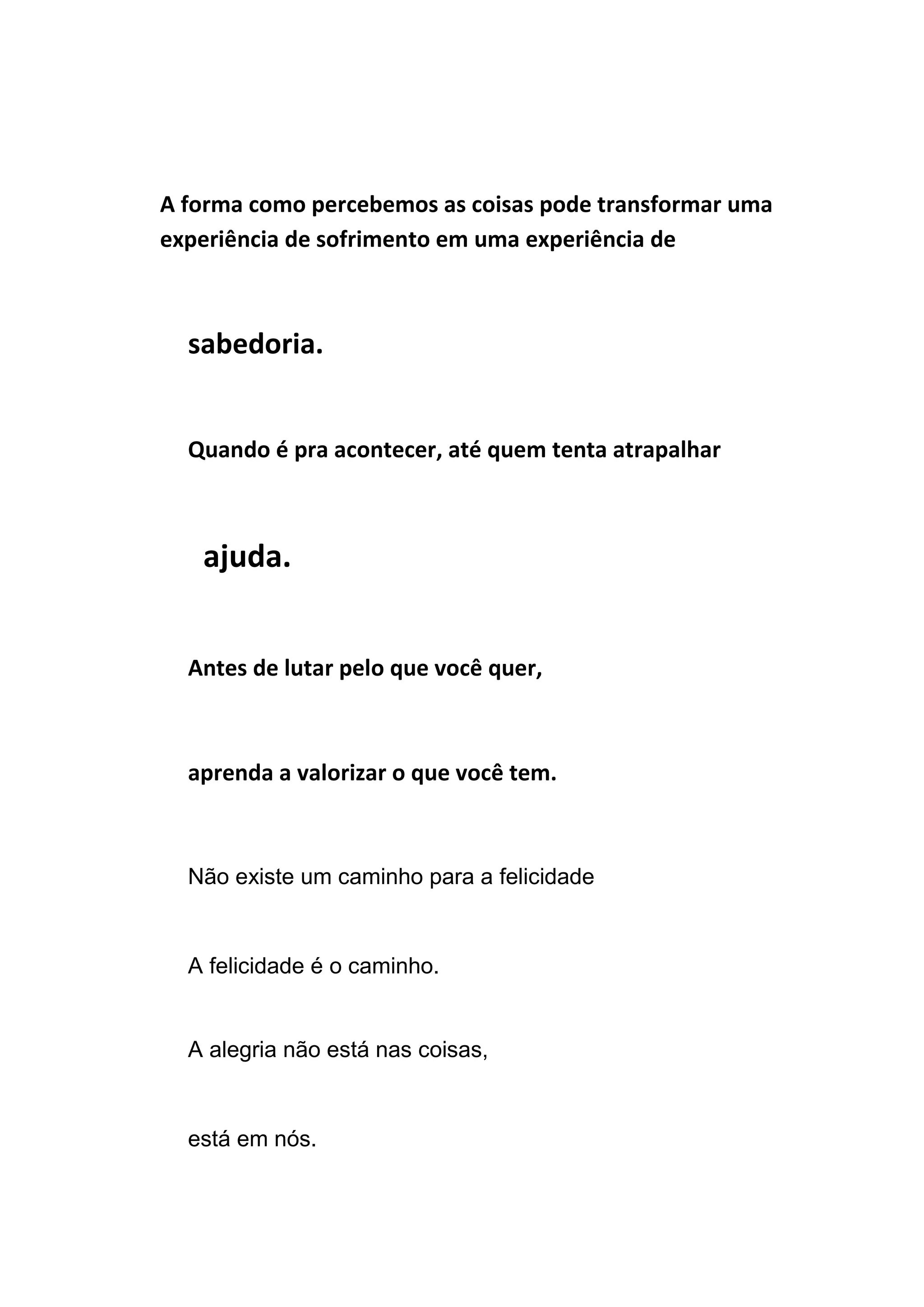 O documento discute como a perspectiva positiva pode transformar sofrimentos em sabedoria, e como a fé em Deus e nunca desistir podem levar à vitória, apesar dos obstáculos. Amizades verdadeiras duplicam alegrias e dividem tristezas.