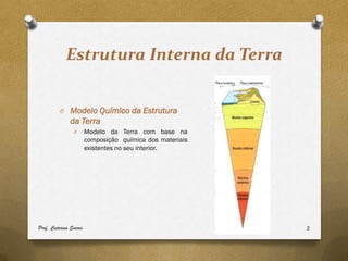 O documento discute a estrutura interna da Terra e a teoria da tectónica de placas. Explica que a litosfera é dividida em placas tectônicas que se movem devido ao magma ascendente nas dorsais oceânicas, empurrando as placas em direções opostas. Também descreve os limites divergentes, convergentes e transformantes entre as placas, e como eles influenciam eventos sísmicos e vulcânicos.