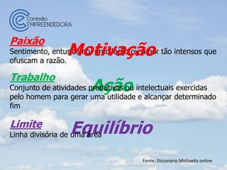 O documento discute os conceitos de paixão, equilíbrio, limite e trabalho, e como encontrar o equilíbrio entre a paixão e o trabalho sem ultrapassar os limites. Ele também reflete sobre a importância de colocar a paixão em ação e se comprometer com os próprios sonhos.