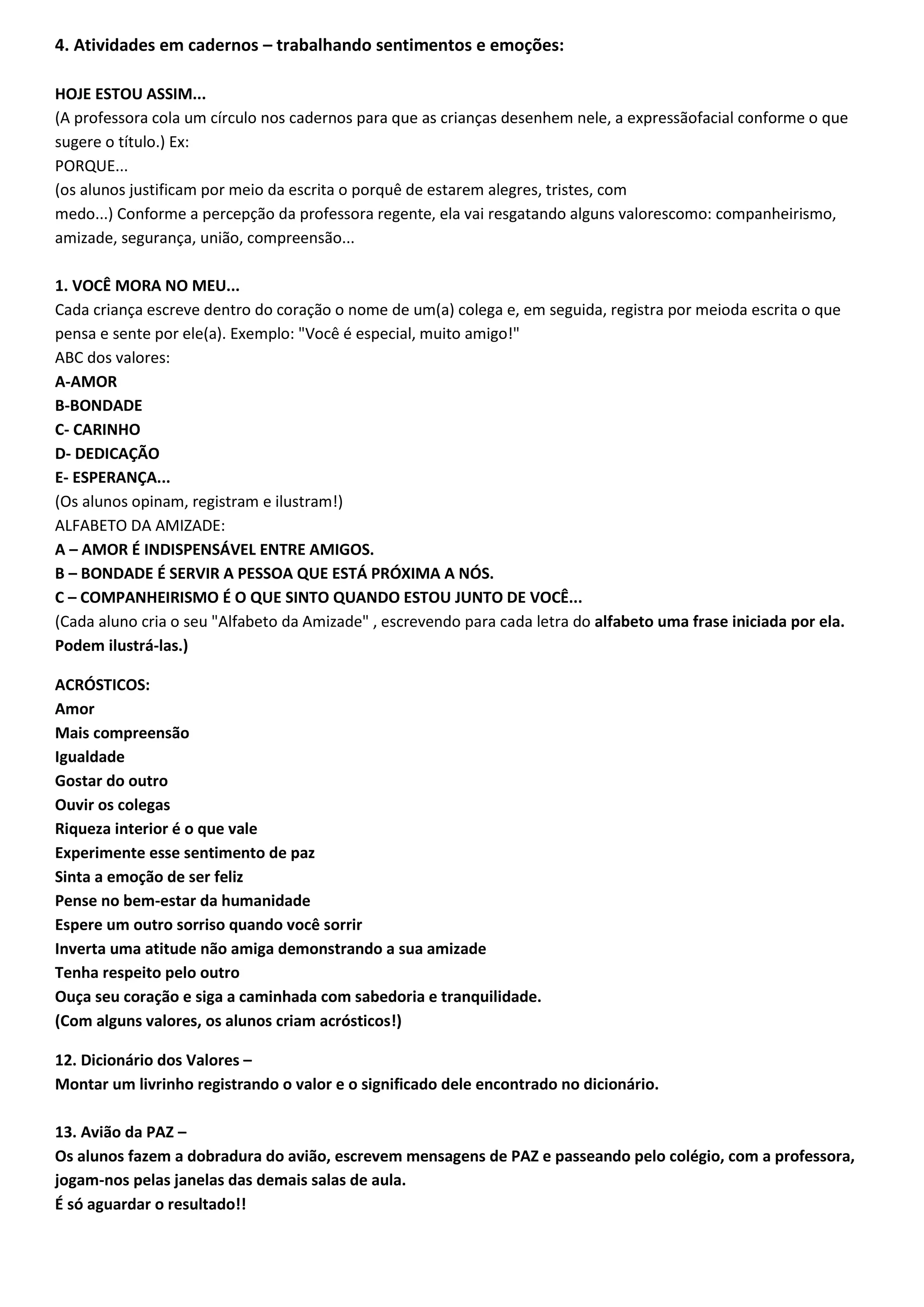 O documento descreve atividades em cadernos e jogos para trabalhar sentimentos e valores com crianças, como amor, compaixão e amizade. As atividades incluem desenhar emoções, escrever sobre amigos, criar acrósticos e dicionários de valores. O objetivo é ajudar as crianças a expressar e compreender melhor seus sentimentos.