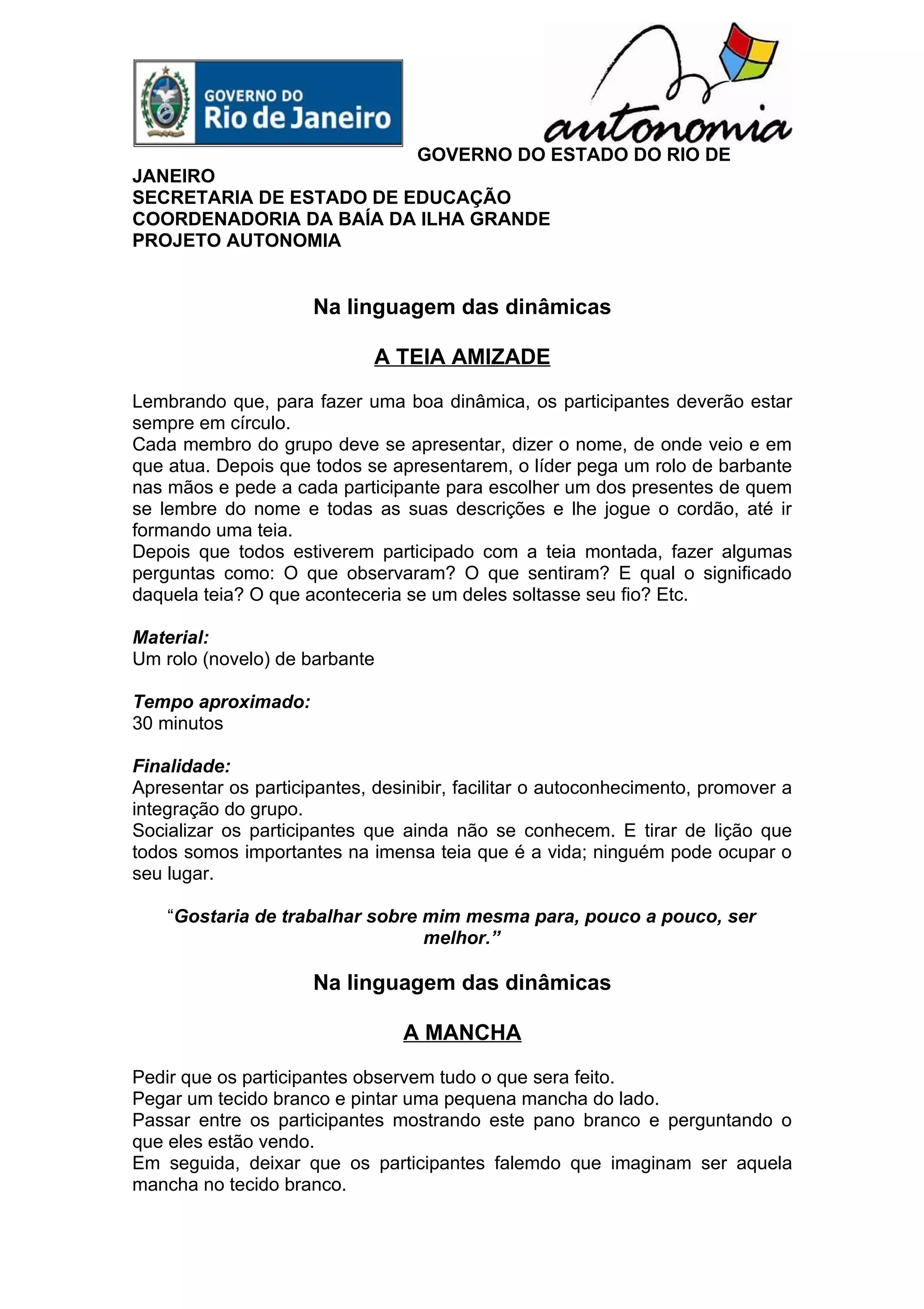 Este documento fornece instruções para dinâmicas de grupo destinadas a promover a integração, autoconhecimento e reflexão. A dinâmica "A Teia Amizade" envolve os participantes se apresentando e formando uma teia com barbante para ilustrar como todos são importantes. "A Mancha" usa um pano branco com mancha para discutir como tendemos a focar nos defeitos dos outros. "O Balão dos Problemas" ajuda os participantes a externalizarem problemas assoprando-os em balões.