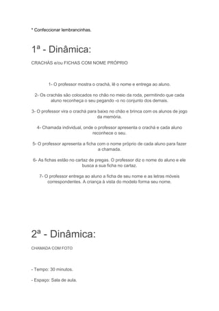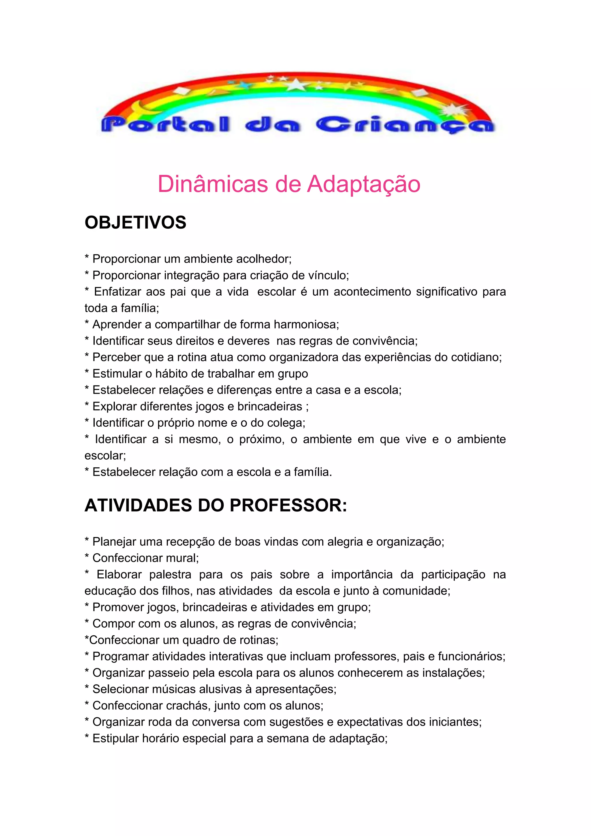 O documento apresenta objetivos e atividades para a adaptação de crianças na educação infantil, incluindo proporcionar um ambiente acolhedor, promover a integração e estabelecer vínculos entre a escola e a família. As atividades do professor incluem recepção aos pais e crianças, elaboração de crachás e fichas com nomes, e dinâmicas como "Cadê? Achei!" para ajudar na adaptação.
